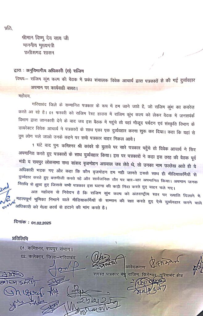 पत्रकारों ने इस घटना को लेकर एसडीएम राजिम को मुख्यमंत्री के नाम ज्ञापन सौंपा और विवेक आचार्य को मेला कार्य से हटाने की मांग की। पत्रकारों ने कहा कि राजिम कुंभ को अंतरराष्ट्रीय पहचान दिलाने में मीडिया की अहम भूमिका रही है, और अगर अधिकारियों का ऐसा रवैया रहा तो आयोजन की प्रतिष्ठा पर भी असर पड़ेगा।