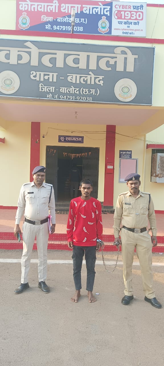 मामले की गंभीरता को देखते हुए श्रीमान पुलिस अधीक्षक बालोद श्री सुरजन राम भगत के निर्देशन, अतिरिक्त पुलिस अधीक्षक बालोद अशोक कुमार जोशी, अतरिक्त पुलिस अधीक्षक श्रीमती मोनिका ठाकुर के मार्गदर्शन में,पुलिस अनुविभागीय अधिकारी बालोद देवांश सिंह राठौर व थाना प्रभारी बालोद निरीक्षक रविशंकर पाण्डेय के द्वारा तत्काल टीम गठित कर 24 घंटे के अंदर आरोपी को विधिवत् गिरफ्तार कर न्यायिक रिमांड पर भेजा गया है। आरोपी को गिरफ्तार करने में निरीक्षक रविशंकर पाण्डेय, सउनि देवकुमारी साहू, प्र.आर. 1349 भगवान सिंह, आरक्षक 110 तुमेश सिन्हा, आरक्षक 468 डिगेश पटेल का सराहनीय कार्य रहा।