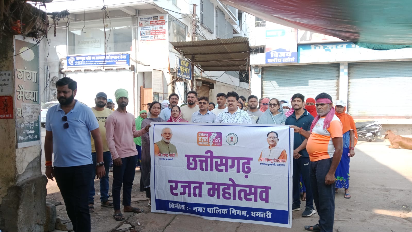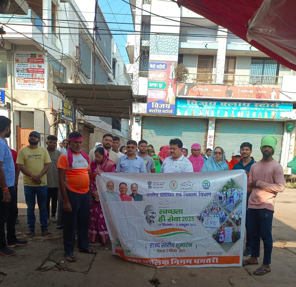 धमतरी – रजत जयंती वर्ष एवं स्वच्छ भारत मिशन के अंतर्गत संचालित “स्वच्छता ही सेवा” अभियान के अवसर पर नगर निगम धमतरी द्वारा शनिवार को शहर के मुख्य बाजार एवं व्यावसायिक क्षेत्र में विशेष सफाई अभियान चलाया गया। अभियान के दौरान चिन्हांकित स्वच्छता लक्षित इकाई (सिटीयू) के अंतर्गत नागरिकों की सक्रिय भागीदारी रही।गोल बाजार परिसर में हुए सफाई एवं रूपांतरण कार्यक्रम में महापौर श्री रामू रोहरा,एम आईसी सदस्य विभा चंद्राकर, पार्षद राकेश चंदवानी,चंद्रभागा साहू, जनप्रतिनिधिगण, स्थानीय व्यापारी, सामाजिक संगठन तथा बड़ी संख्या में नागरिक उपस्थित रहे। बाजार क्षेत्र में फैली गंदगी की सफाई, कचरा उठाव, नालियों की सफाई एवं सार्वजनिक स्थलों को स्वच्छ और आकर्षक स्वरूप देने का कार्य किया गया। इस अवसर पर नागरिकों को स्वच्छता बनाए रखने की शपथ भी दिलाई गई।