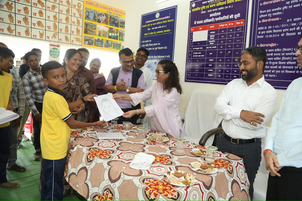 कांकेर यात्रा के दौरान भारत सरकार की ओर से अतिरिक्त सचिव सचिव रेशम मावा मॉडल कोचिंग संस्थान के भ्रमण दिनांक ग्राम कोदाभट स्थित एलसीडी श्रवण एवं दृष्टि बाधार्थ विशेष विद्यालय प्रायद्वीप, जहां पर विशेष आवश्यकता वाले छात्रों ने साइन लैंग्वेज के साथ स्वागत किया। इस दौरान अनैतिक बच्चों ने वेलकम गीत गाया और खुद के द्वारा उन्हें स्टैमिना की पेंटिंग्स तैयार कीं। इस अवसर पर उप पर्यवेक्षक समाज कल्याण श्रीमती क्षमा शर्मा द्वारा विद्यालय से संबंधित जानकारी दी गई। उन्होंने बताया कि 50 सीटर उक्त विद्यालय में बारहवीं तक की मूर्तियां संचालित हैं और कुल 45 छात्र अध्ययनरत हैं, जिनमें 33 श्रवण बाधित और 12 दृष्टिबाधित बच्चे शामिल हैं। यह भी बताया गया है कि विशेष विद्यालय परिसर में सभी छात्रों के लिए निःशुल्क आवासीय एवं भोजन सुविधा उपलब्ध है और निकट भविष्य में जिला प्रशासन के सहयोग से स्मार्ट कक्षाएं संचालित करने की योजना है। इस दौरान अतिरिक्त सचिव ने यहां बच्चों के साथ-साथ शिक्षा के साथ-साथ स्टूडियो के विभिन्न खंडों का प्रशिक्षण देने की बात कही, ताकि यहां के बच्चे बड़े आत्मनिर्भर बन सकें। इस अवसर पर प्रधान सचिव निलेशकुमार महादेव क्षीरसागर, संयुक्त सचिव जेनेहन विकास अनुपम विद्यार्थी, जिला पंचायत अध्यक्ष हरेश मंडावी, प्रधान सचिव कांकेर संगम वर्मा सहित संबंधित संस्था के अधिकारीगण उपस्थित थे।