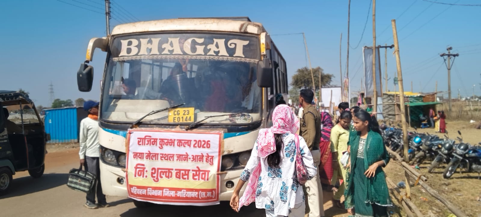 गरियाबंद – कुंभ कल्प मेला में नवीन मेला मैदान चौबेबांधा तक पहुंचने के लिए परिवहन विभाग जिला गरियाबंद द्वारा दो यात्री बस की सुविधा मुहैया कराई गई है। यह सेवा निशुल्क है। दिन भर कई बार आना-जाना कर रहे हैं जिनमें से एक बस राजिम के बस स्टैंड में खड़ी रहती है और दूसरी मेला मैदान में। यह बस लाने का तो काम करते ही हैं साथ में ले जाने के लिए भी यात्रियों का इंतजार करते रहते हैं। बताना होगा कि बस स्टैंड से नवीन मेला मैदान सड़क मार्ग से दूरी तकरीबन ढाई किलोमीटर है जिनके पास खुद के वाहन है वह तो आना-जाना कर पा रहे हैं लेकिन जो पैदल यात्री है उनके लिए प्रशासन ने गंभीरता से विचार किया और बस सुविधा प्राप्त किया है।