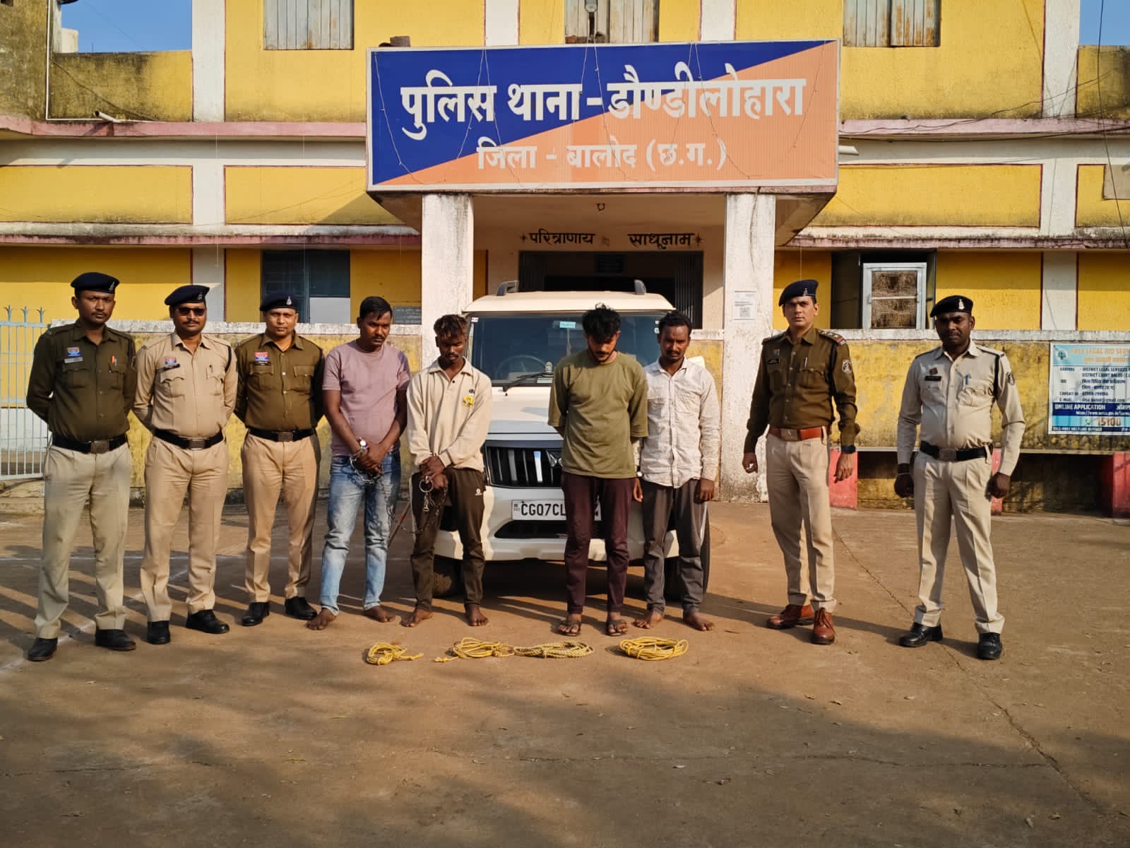 विवरण -मामले का संक्षिप्त विवरण इस प्रकार है कि प्रार्थी गामा नेताम पिता स्व. रमेश नेताम उम्र 22 साल जाति देवार निवासी वार्ड नंबर 11 अम्बेडकर पारा डौण्डी लोहारा जिला बालोद (छ.ग.) ने रिपोर्ट दर्ज करया कि दिनांक 02.01.2026 को हमारे सुबर दिखाई नहीं देने पर आसपास में खोजचीन किये लेकिन सुवर नही मिला तब हम लोग अरिहंत किराना दुकान डौण्डी लोहारा के विडियो फुटेज को देखे तो दिनांक 23.12.2025 को एक सफेद कलर के बोलेरो वाहन में डौण्डी लोहारा के बाजार पारा में किसी अज्ञात व्यक्तियो के द्वारा हमारे सुवर को दौड़ा दौड़ा कर पकड़ कर चोरी कर वाहन में भर रहे थे इसी दिनांक 23.12.2025 को रात्रि में बस स्टैण्ड डौण्डी लोहारा के पास एक सफेद कलर के बोलेरो बाहन को देखा था तब विडियो फुटेज के आधार पर आसपास के लोगों से पूछताछ कर पता किया तो पता चला कि उक्त बोलेरो वाहन का नंबर सीजी 07 सी.एल 7274 है इसी वाहन के चालक एवं इनके अन्य साथियो के द्वार दिनांक 22,23.12.2025 के रात्रि करीबन 02 से 03 बजे के बीच हमारे लगभग 14-15 नग छोटा बड़ा सुबर को बोरी कर ले गया है, कि प्रार्थी की रिपोर्ट पर अपराय पंजीचद्ध कर विवेचना में लिया गया था। दिनांक 14.02.26 को प्रकरण में विवेचना के दौरान बोलेरो वाहन का नंबर सीजी 07 सी.एल 7274 के चालक एवं मालिक पंकज देशमुख निवासी ग्रांम थनौद जिला दुर्ग से पूछताछ करने पर बलाया कि दिनांक 22.12.25 को इसके साथी अजय देवराज, अरूण नेताम एवं अन्य साथियों के द्वारा योजना बनाकर तीन-चार रस्सी, जाली, सुवर चोरी करने के लिए पकड़े थे, हम लोग उक्त बेलोरो वाहन में बैठे वहां से पाटेश्वर धाम आये वहां आसपास पुर्मे और शराब पीते सभी लोग घुमते हुए करीबन 1-2 बजे रात्रि डौण्डीलोहारा में पहुंचे तो बाजार चौक डौण्डीलोहारा में बहुत सारे सुबर को पुमते हुये देखा तो तुलेश नेताम, अजय देवराज, अरूण नेताम अपने अन्य साथियों के द्वारा बोलेरो से उतर कर सुबर को प्लास्टिक पीला, कलर का रस्सी, जाली से फंदा बनाकर दौडा दौडाकर पकडे और बोलेरो में भर दिये, इसी तरह दिनांक 23.12.2025 को उक्त बोलेरो में सभी लोग बैठ कर रात्रि में करीबन 01 से 02 बजे डौण्डी लोहारा बाजार चौक आकर सुबर को रस्सी का फंदा, जाली बनाकर फिर से पकड़ कर चोरी कर बोलेरो वाहन में रखे और बोलेरो वाहन से सुबर को अपने घर अटल निवास उरला दुर्ग में छोड़े थे उक्त आरोपियों के द्वारा तभी सुबर को आपस में बाट कर, काटकर मार्केट में विकी किये है विक्री रकम को आपस में बाट लिये है आरोपी तुलेश नेताम एवं उसके साथियों से पीले रंग का तीन नग लंबा रस्सी एवं 1600 रुपये नगद विकी रकम बरामद कर जप्त किया गया है तथा सुबर विक्री रकम से 32,000 रूपये का विवो मोचाईल फोन खरीदा था जिसे जप्त किया गया है आरोपी पंकज देशमुख से घटना में प्रयुक्त बोलेरो वाहन कमांक सीजी 07 सी.एल 7274 को विधिवत जप्त किया गया है