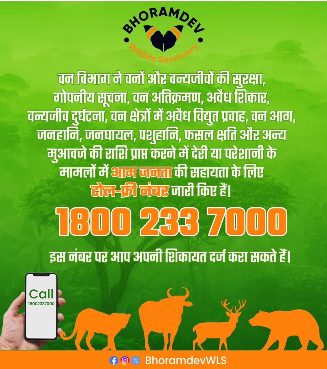 कवर्धा – मुख्य वन संरक्षक, वन्यप्राणी, छ.ग. रायपुर द्वारा आम जनों की सहायता के लिए टोल फ्री नंबर 1800 233 7000 जारी किया गया है। इस नंबर पर वनों एवं वन्यप्राणियों की सुरक्षा, गोपनीय सूचना, वन अतिक्रमण, अवैध शिकार, वन्यप्राणी दुर्घटना, वन क्षेत्रों में अवैध विद्युत करेंट, वन अग्नि, जनहानि, जनघायल, पशुहानि, फसल हानि एवं अन्य मुआवजा भुगतान की राशि प्राप्त नहीं होने, विलंब होने अथवा आम जनता को विभाग से संबंधित किसी भी प्रकार की परेशानी होने पर सूचना/शिकायत दर्ज की जा सकती है । वनमंडलाधिकारी, कवर्धा वमंडल के द्वारा उक्त नंबर के प्रचार-प्रसार के लिए अधीनस्थ समस्त क्षेत्रीय अधिकारी को निर्देशित किया गया है कि ग्राम पंचायतों, नुक्कड़ों, चौक-चौराहों में पाम्पलेट चिपकाकर, दीवार लेखन कराकर, स्थानीय व्हाट्सअप गु्रप पर भी प्रचार-प्रसार किया जाये। अधिनस्थ समस्त कार्यालयों के सूचना पटल पर सुलभ दृष्टिगोचर उक्त नंबरों को प्रदर्शित किया जाये। जंगल सफारी, चिड़ियाघरों, अभ्यारण्य, उद्यान में पर्यटकों का अधिक आवागमन होता है। अतः इन स्थलों पर भी इन नंबरों का प्रचार-प्रसार किया जाये। विभाग द्वारा विभिन्न जागरूकता प्रशिक्षण कार्यक्रम आयोजित किये जाते है जिसमें कई हितग्राही भाग लेते हैं, ऐसे जागरूकता प्रशिक्षण कार्यक्रम में भी इसका अनिवार्य रूप से प्रदर्शन किया जाना सुनिश्चित करें।