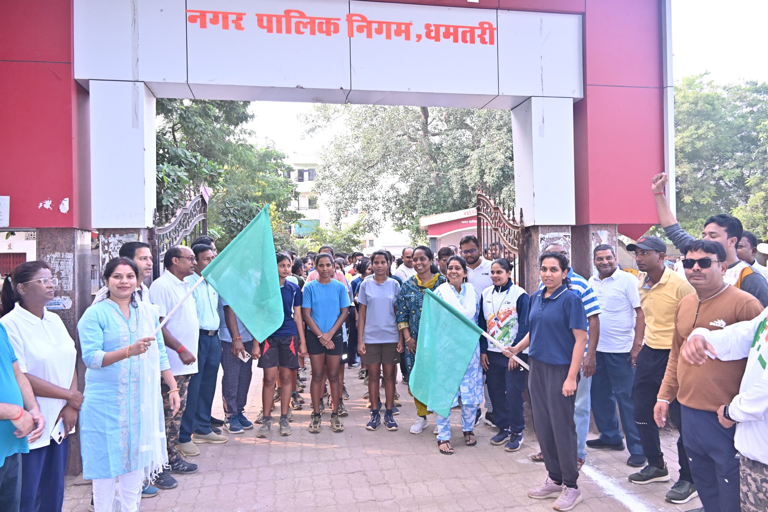 पूर्व विधायक श्रीमती रंजना साहू एवं कलेक्टर ने धमतरी में आयोजित एकता दौड़ को झंडी दिखाकर किया रवाना।