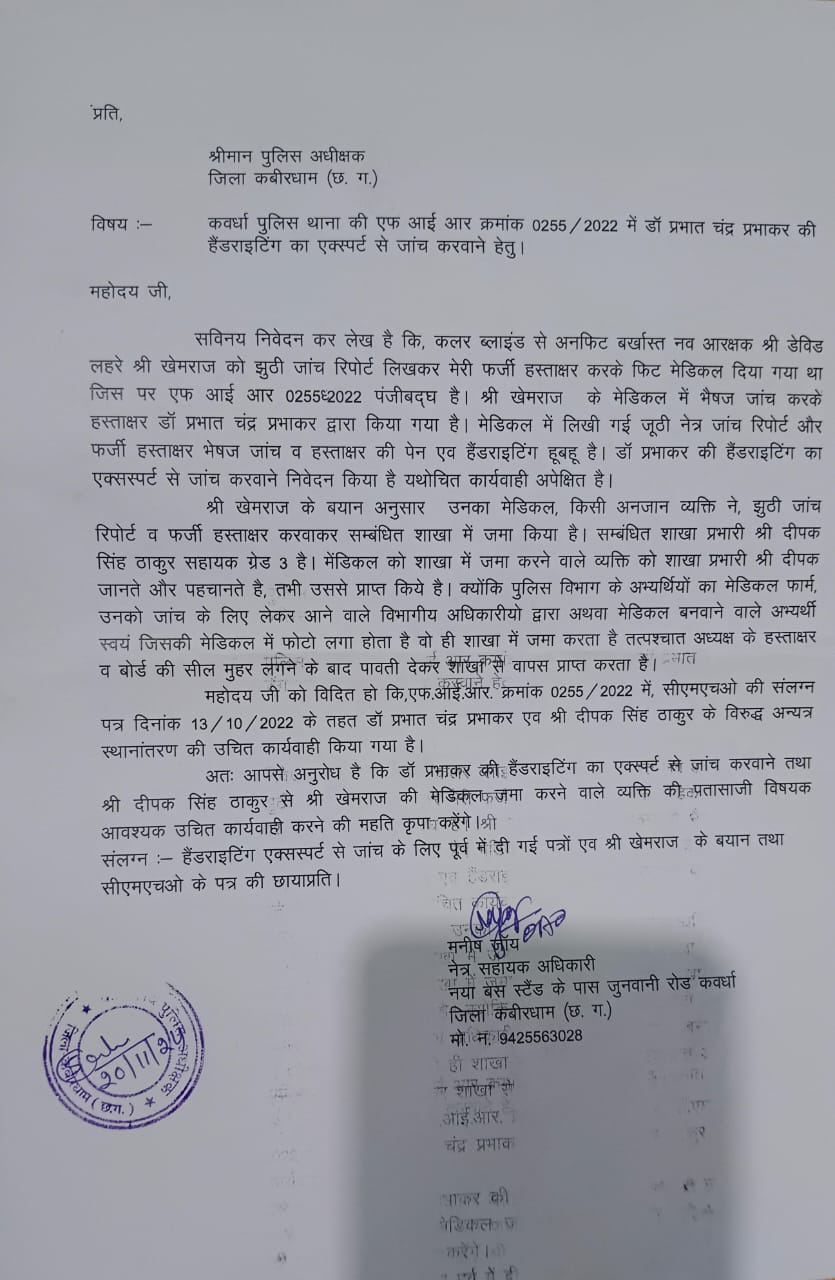 मनीष जॉय ने पुलिस अधीक्षक को आवेदन देकर बताया है कि, बर्खास्त नव आरक्षक के प्रमाण पत्र में मेडिकल जांच के लिखावट और झुठी नेत्र जांच रिपोर्ट की लिखावट व फर्जी हस्ताक्षर डॉ प्रभात चन्द्र प्रभाकर की है। हैंडराइटिंग विशेषज्ञ से जांच कर पुष्टि करने की मांग किया है। यहां ये बताना जरूरी है कि डॉ प्रभाकर वर्तमान में जिला मुंगेली में सीएमएचओ के प्रभार में है। मुंगेली सीएमएचओ डॉ प्रभाकर अपने पद व रसूख के दम पर विभागीय और पुलिसिया कार्यवाही से बचे बैठे हैं।बहरहाल इसका सही खुलासा तो डॉ प्रभाकर की हैंडराइटिंग का एक्स्पर्ट की जांच के बाद ही होगा।