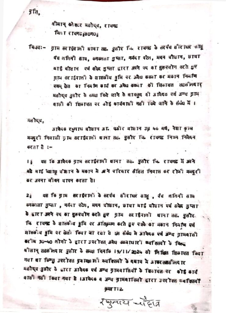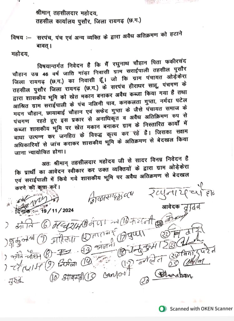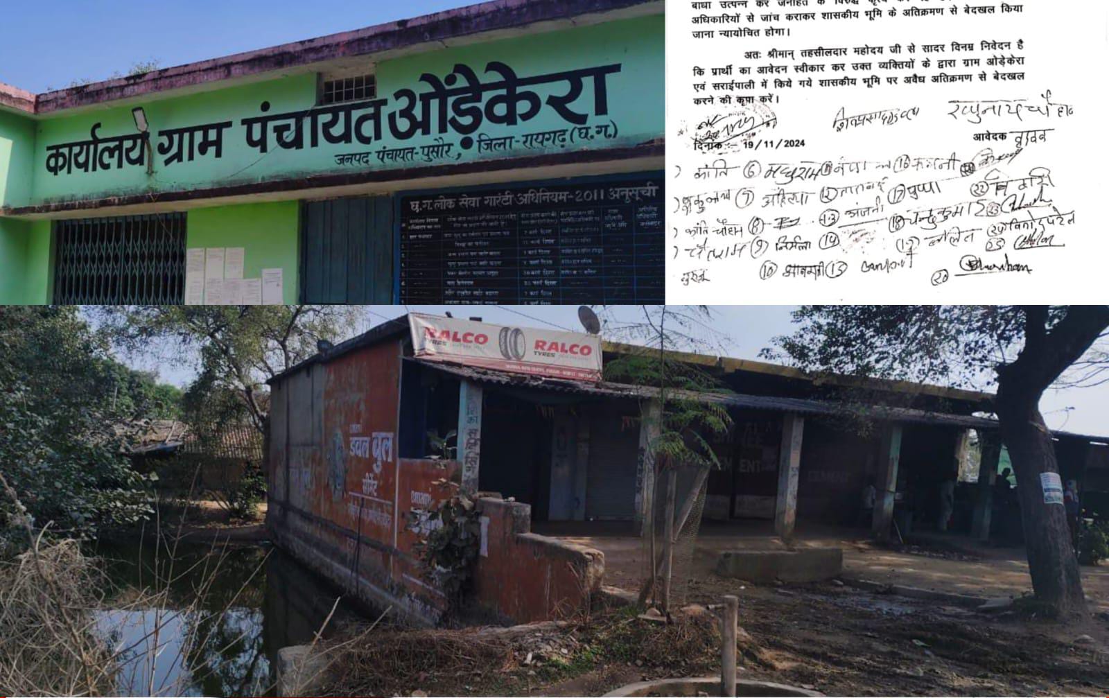 ज्ञात हो कि ग्राम पंचायत ओड़ेकेरा और सराईपाली में शासकीय भूमि पर अतिक्रमण की शिकायत पूर्व में 22/01/2024 को जिला कलेक्टर से की गई थी लेकिन दस माह बाद भी कोई कार्यवाही नहीं हुई जिसके बाद पुनः 19 /11/2024 को भारी संख्या में ग्रामीणों द्वारा हस्ताक्षर युक्त शिकायत पुसौर तहसील में दर्ज कराया था लेकिन इस शिकायत पर कोई कार्यवाही नहीं हुई जिसके बाद 31/12/2024 को तहसील न्यायालय पुसौर में पुनः विधिवत भू.रा.सं. की धारा 248 के तहत आवेदन पत्र प्रस्तुत किया गया है जिस पर दिनांक 07/01/2025 को नायब तहसीलदार पुसौर ने प्रकरण दर्ज करने, अनावेदको के विरुद्ध नोटिस तालीम कर , काम रोको आदेश जारी करते हुए हल्का पटवारी से स्पष्ट प्रतिवेदन के साथ पी- 23 रिपोर्ट जल्द प्रस्तुत करने को आदेशित किया गया है।