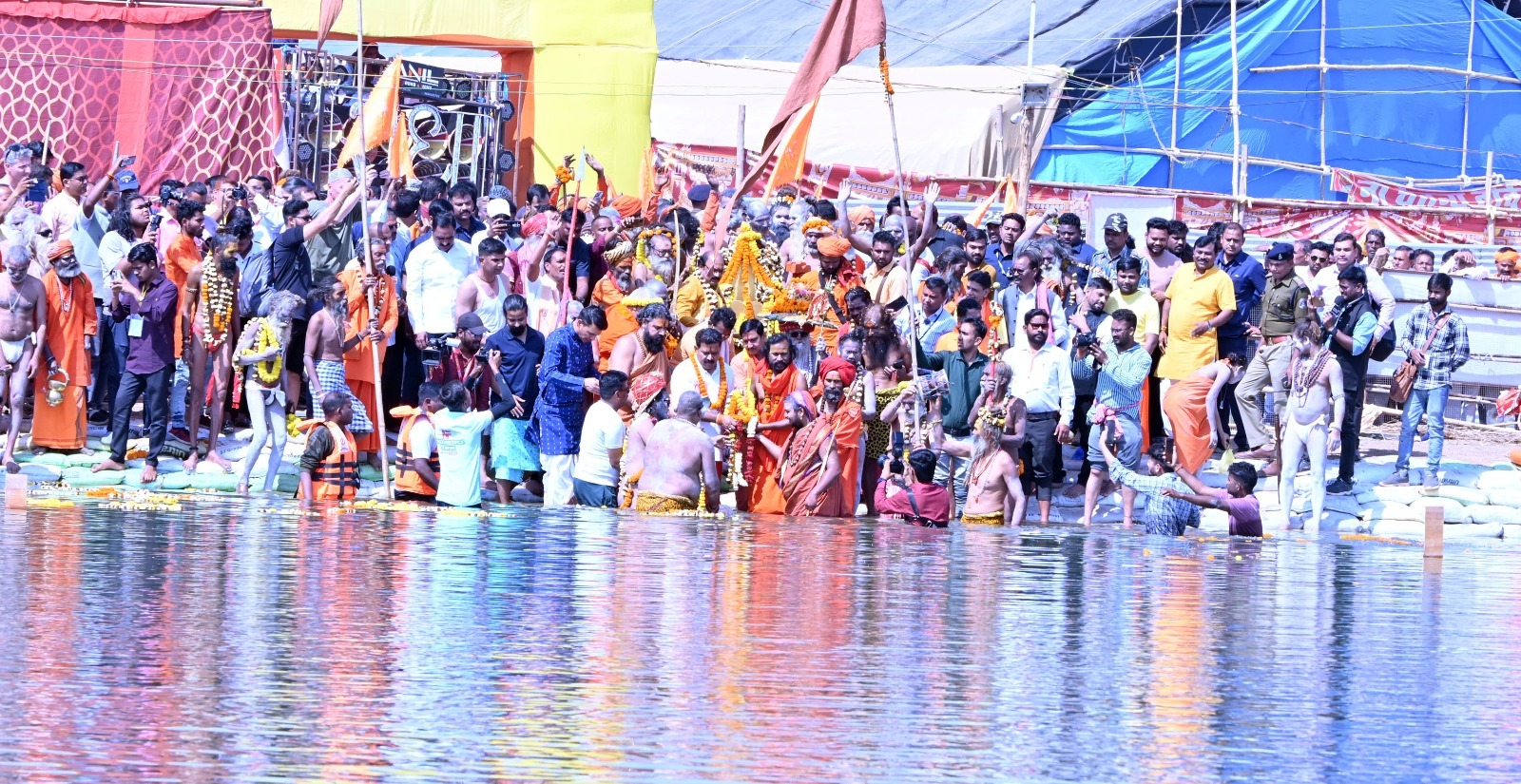 शोभायात्रा संत समागम स्थल से शुभारंभ होकर श्रीकुलेश्वरनाथ महादेव मंदिर के पीछे मार्ग से नेहरू बाल उद्यान होते हुए, राजिम पुल, पं. सुंदरलाल शर्मा चौक, गौरवपथ राजिम, व्हीआईपी मार्ग होते हुए मेला में बने शाही कुंड में पहुंचे। शोभायात्रा का स्वागत दोनों शहर नवापारा और राजिम में विभिन्न चौक चौराहों में फूल बरसा कर किया गया। शोभायात्रा में विभिन्न चौक में अनेकों अस्त्र-शस्त्रों से लैस नागा बाबाओं, साधु-संतों ने शौर्य प्रदर्शन करते हुए अखाडा चलाते रहे। नागा साधुओं के तलवार और फरसा भांजते खुशी से नाचते देखकर मेले में आए अंचलवासी भी रोमांचित हो उठे। धीरे-धीरे आगे बढ़ते हुए शोभायात्रा शाही कुंड के पास पहुंची। यहां नागा साधुओं ने विधि विधान के साथ शस्त्र पूजन पश्चात कुंड में छलांग लगाई। नागा बाबाओं के साथ केन्द्रीय राज्य मंत्री तोखन साहू, उप मुख्यमंत्री विजय शर्मा, राजिम विधायक रोहित साहू, संजय श्रीवास्तव, राजिम नगर पंचायत के नवनिर्वाचित अध्यक्ष महेश यादव भी कुंड में डुबकी लगाने के लिए उतर गए। शाही स्नान करने विभिन्न अखाड़ों के साथ स्थानीय जनप्रतिनिधि भी शामिल हुए। इस विहंगम दृष्य को देखने मेला क्षेत्र के अलावा कुंड के पास बड़ी संख्या में श्रद्धालुओं एवं दर्शनार्थियों की भीड़ उमड़ी हुई थी। शाही स्नान पश्चात डिप्टी सीएम विजय शर्मा, केन्द्रीय राज्य मंत्री तोखन साहू, विधायक रोहित साहू पैदल भगवान कुलेश्वर नाथ महादेव मंदिर पहुंचे। जहां भोलेनाथ की पूजा अर्चना कर प्रदेश की सुख समृद्धि और खुशहाली की कामना की।शाही यात्रा की भव्यता का आनंद लेने विदेशी पर्यटक भी शामिल हुए। सुरक्षा के मद्देनजर पुलिस की चाकचौबंध व्यवस्था थी। इस शाही यात्रा में सबसे पहले श्री पंच दशनामी सन्याशी अखाड़ा के नागा साधु, अखिल भारतीय पंच रामानंदी वैष्णव अखाड़ा के तीनों अनी श्रीपंच निर्मोही अनि अखाड़ा, श्रीपंच निर्मोही दिगम्बर अखाड़ा, श्रीपंच निर्मोही निर्वाण, श्री पंचायती अखाड़ा बड़ा उदासीन के अलावा रामदास अखाड़ा, रविदास अखाड़ा, भैरवी शक्ति, हरिद्वार मंडली, करीब पंथ, सतनाम पंथ के संतों एवं उनके अनुयायियों ने भाग लिया।