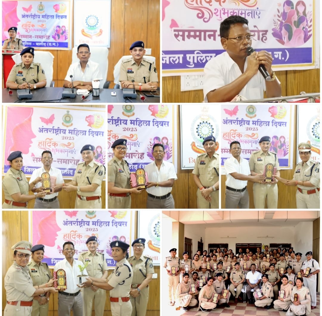 बालोद – पुलिस कार्यालय बालोद में अंतर्राष्ट्रीय महिला दिवस के संबंध में कार्यक्रम आयोजित किया गया ,श्रीमान पुलिस अधीक्षक महोदय एस.आर. भगत, अतरिक्त पुलिस अधीक्षक अशोक कुमार जोशी, अतरिक्त पुलिस अधीक्षक महोदया मोनिका ठाकुर,, नगर पुलिस अधीक्षिका डॉ. चित्रा वर्मा ,रक्षित निरीक्षक रेवती वर्मा, महिला सेल प्रभारी श्रीमती गायत्री शर्मा , व जिला बल बालोद की महिला अधिकारी/कर्मचारी सम्मिलित हुए, अंतर्राष्ट्रीय महिला दिवस कार्यक्रम के अवसर पर जिले में सराहनीय कार्य करने वाली सभी महिला अधिकारी/कर्मचारी को पुलिस अधीक्षक महोदय श्री .एस .आर .भगत व आला अधिकारियों द्वारा प्रशस्ति पत्र देकर सम्मानित किया गया। साथ ही महिलाओं पर होने वाले अपराध जागरूकता, महिलाओं के कानूनी अधिकार, समानता का अधिकार, सामाज परिवार में उनकी भूमिका की सराहना करते हुए महत्त्वपूर्ण जानकारियां साझा कर देश एवं समाज हित कार्यों में सहयोग करने आगे बढ़ने हेतु मोटिवेट कर सभी को अंतर्राष्ट्रीय महिला दिवस की शुभकामनाएं दी गई।