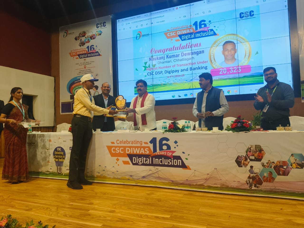 कार्यक्रम के दौरान धमतरी जिले के ग्राम पंचायत अछोटा में संचालित कॉमनवेल्थ सर्विस सेंटर डॉ. विलेज उद्यमी श्री नॉकंज कुमार को विशेष रूप से सम्मानित किया गया। उन्होंने अप्रैल 2025 से जुलाई 2025 तक संयुक्त अरब अमीरात में दूसरा सबसे बड़ा डिजिटल ट्रांसजेक्शन दर्ज किया है। इस उपलब्धि के लिए उप मुख्यमंत्री श्री शर्मा द्वारा उन्हें विशिष्टता पत्र एवं स्मृति चिन्ह प्रदान किया गया। इस उपलब्धि पर धमतरी कलेक्टर अविनाश मिश्रा एवं मुख्य कार्यपालन अधिकारी जिला पंचायत श्रीमती रोमासिग्र्रा ने नौकंज कुमार को बधाई एवं शुभकामनाएं दीं। उन्होंने कहा कि ऐसी पहली डिजिटल छत्तीसगढ़ की दिशा में माइल्स का पत्थर और अन्य कंपनियों को भी प्रेरणा मिलेगी।