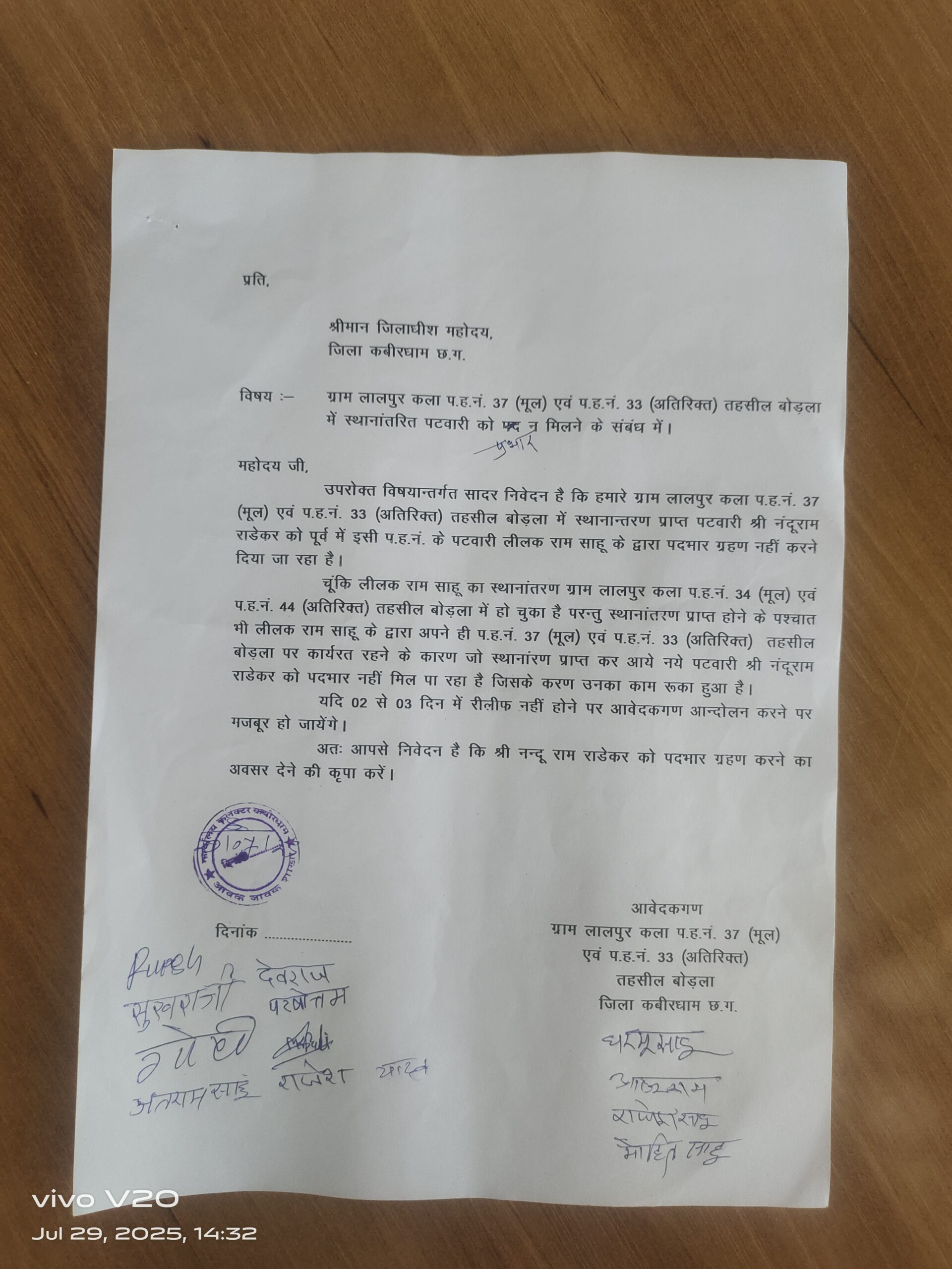कबीरधाम – ज़िले में प्रशासनिक आदेश की अवहेलना का मामला सामने आया है। हल्का नंबर 37, लालपुर में पदस्थ पटवारी लीलक साहू का ट्रांसफर तो कर दिया गया है, लेकिन उन्हें अभी तक रिलीव नहीं किया गया है।इस वजह से पिछले 20 दिनों से ग्रामीणों और छात्रों को भारी परेशानियों का सामना करना पड़ रहा है। राजस्व संबंधित कामों के अटकने से आम जनता में रोष व्याप्त है।ग्राम पंचायत सरपंच के नेतृत्व में दर्जनों ग्रामीण मंगलवार को कलेक्टर कार्यालय पहुंचे, और उन्होंने पटवारी को तत्काल रिलीव करने की मांग की। ग्रामीणों का कहना है कि अगर जल्द कार्यवाही नहीं हुई तो वे उग्र आंदोलन करने को मजबूर होंगे।प्रशासन अब क्या कदम उठाता है, इस पर सबकी निगाहें टिकी हैं।