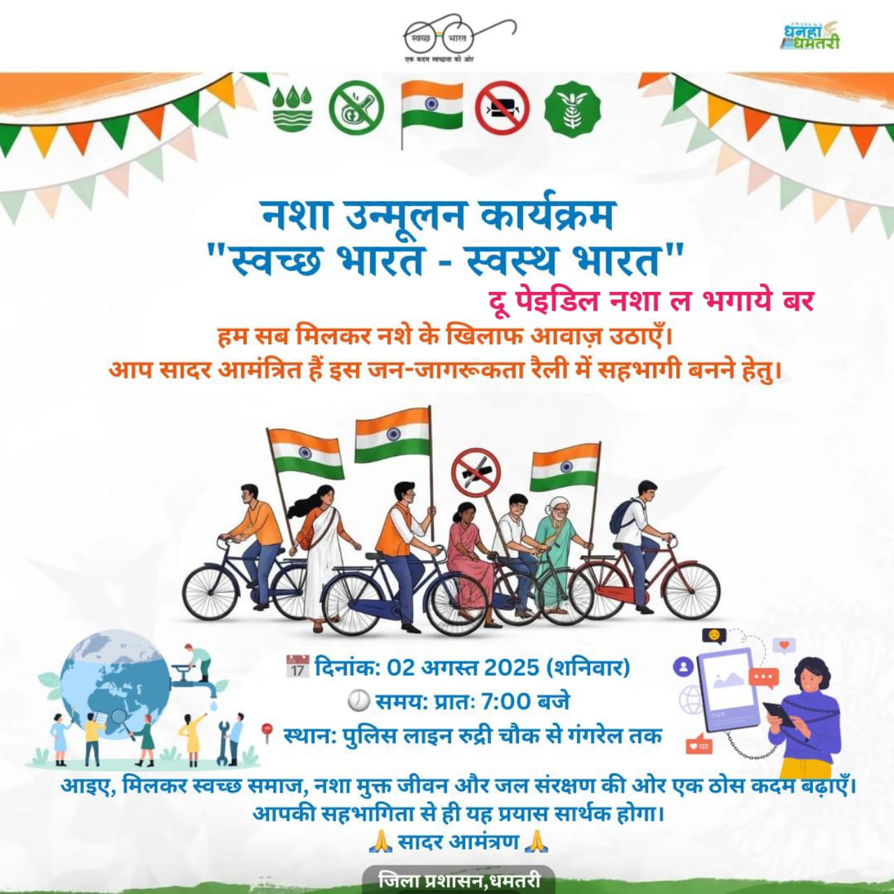 धमतरी – जिले में नशा मुक्त भारत अभियान के तहत नशे के खिलाफ जनजागरूकता फैलाने की दिशा में एक महत्वपूर्ण पहल की जा रही है। सहायक संचालक समाज कल्याण डॉ मनीषा पाण्डे ने बताया कि शनिवार 2 अगस्त को प्रातः 7.00 बजे जिला मुख्यालय स्थित पुलिस लाइन रुद्री चौक से गंगरेल तक साइकिल रैली निकाली जाएगी। इस जनजागरूकता रैली में कलेक्टर अबिनाश मिश्रा ने जिला स्तर के समस्त अधिकारियों, स्कूल एवं कॉलेज के विद्यार्थियों, सामाजिक संगठनों के सदस्यों, जनप्रतिनिधियों, पार्षदों और आम नागरिकों से सहभागिता की अपील की है। इस अभियान का मुख्य उद्देश्य समाज में नशे के दुष्प्रभावों के प्रति जागरूकता लाना है, साथ ही स्वच्छता का संदेश भी देना है। रैली के दौरान प्रतिभागियों को “नशा मुक्त भारत” की शपथ भी दिलाई जाएगी। कलेक्टर ने सभी से नशे से दूर रहने और समाज में नशा मुक्त वातावरण निर्माण के लिए संकल्प लेने का आह्वान किया है।यह साइकिल रैली सामाजिक चेतना के साथ-साथ स्वास्थ्य और स्वच्छता के संदेश को भी जन-जन तक पहुंचाने का माध्यम बनेगी।