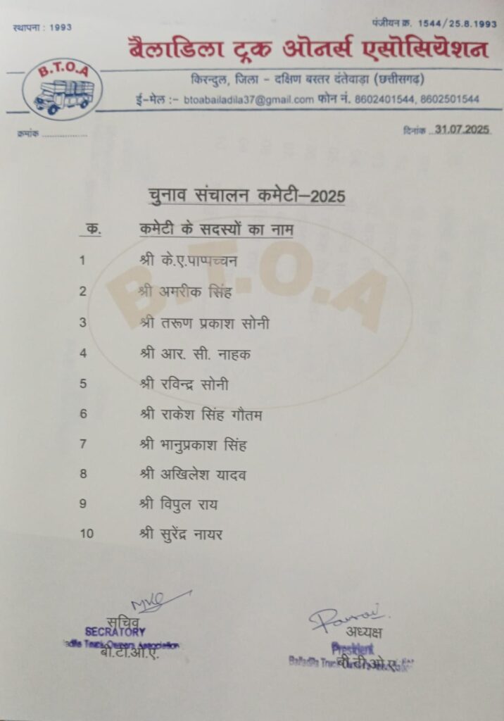 साथ ही सभी सदस्यों की सहमति से चुनाव अधिकारी के द्वारा एक चुनाव संचालन समिति का भी गठन किया गया है जिसमे सर्वसम्मति से पप्पू जायसवाल ,मृणाल राय ,संजय भदौरिया ,रविन्द्र सोनी, अमरीक सिंह, आर सी नाहक ,तरुण प्रकाश सोनी, राकेश सिंह गौतम ,भानुप्रकाश सिंह ,विपुल राय को चुनाव संचालन समिति का सदस्य मनोनीत किया गया है ।उल्लेखनीय हैं कि उक्त चुनाव संचालन समिति 13 अगस्त को पदाधिकारियो के चुनाव के बाद शपथ ग्रहण तक ही प्रभावशाली रहेगी । इन सब के बीच किरंदुल के गली मोहल्लों में एक चर्चा आज फिर आम हो चली है कि जब 31 जुलाई को बैलाडीला ट्रक मालिकों की संस्था बिटीओ के वार्षिक चुनाव के लिए 13 अगस्त को होने वाले चुनाव के लिए चुनाव संचालन निष्पादित करने के लिए वरिष्ठ सदस्यों की एक टीम का गठन कर लिया गया था तो फिर उस लिस्ट को केंसिल कर 3 अगस्त को नई चुनाव संचालन समिति का गठन करने की क्या जरूरत पड़ी । उल्लेखनीय हैं कि 31 जुलाई को बनाई गई चुनाव संचालन समिति में संघ के वरिष्ठ संस्थापक सदस्य सुरेंदर नायर और बिटीओ के भीष्म पितामह के० ए ० पापा चंद के नामों की क्या आवस्यकता पड़ी ।उल्लेखनीय हैं कि वर्तमान में बिटीओ का भवन पापा चंद की जमीन पर खड़ा हुआ है जिसको पापा चंद ने निःशुल्क बिटीओ को दे दिया हैं ।