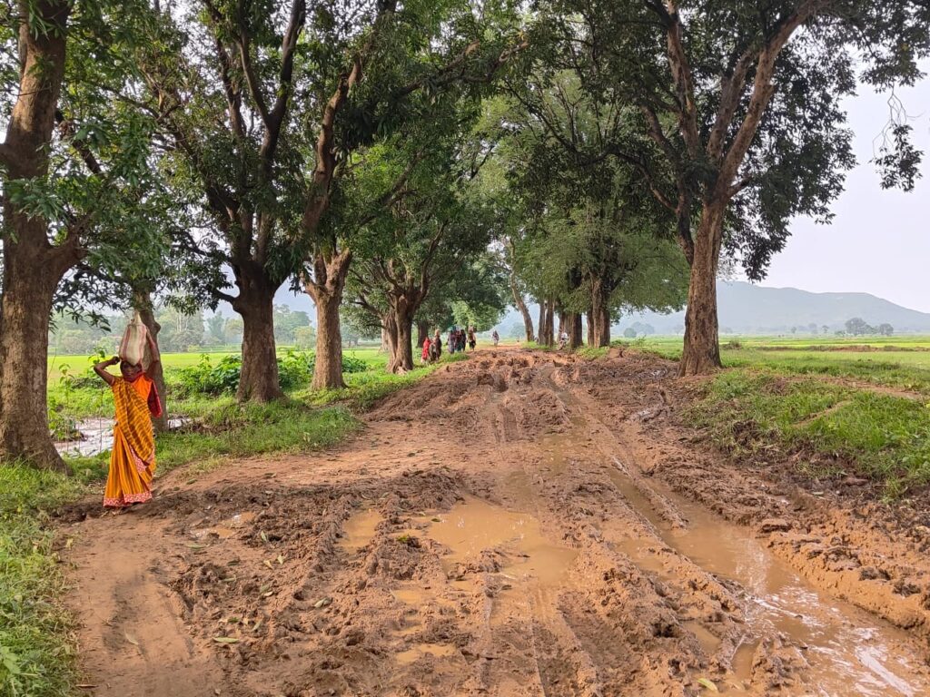 रायगढ़ :- बारिश थम चुकी थी, लेकिन दलदल अब भी गाँव को अपनी गिरफ्त में लिए हुए था। धरमजयगढ़ के कंड राजा से पंडरा पाट जाने वाला रास्ता – नाम तो सड़क है, मगर हालत ऐसी कि पैरों से कदम निकालना भी मुश्किल। इसी कीचड़ भरे और टूटे-फूटे रास्ते पर, ग्राम पंचायत विजयनगर के ग्राम कंडरजा मोहला पटना पारा में, एक पति अपनी बीमार पत्नी को गोद में उठाए अस्पताल की ओर बढ़ रहा था।