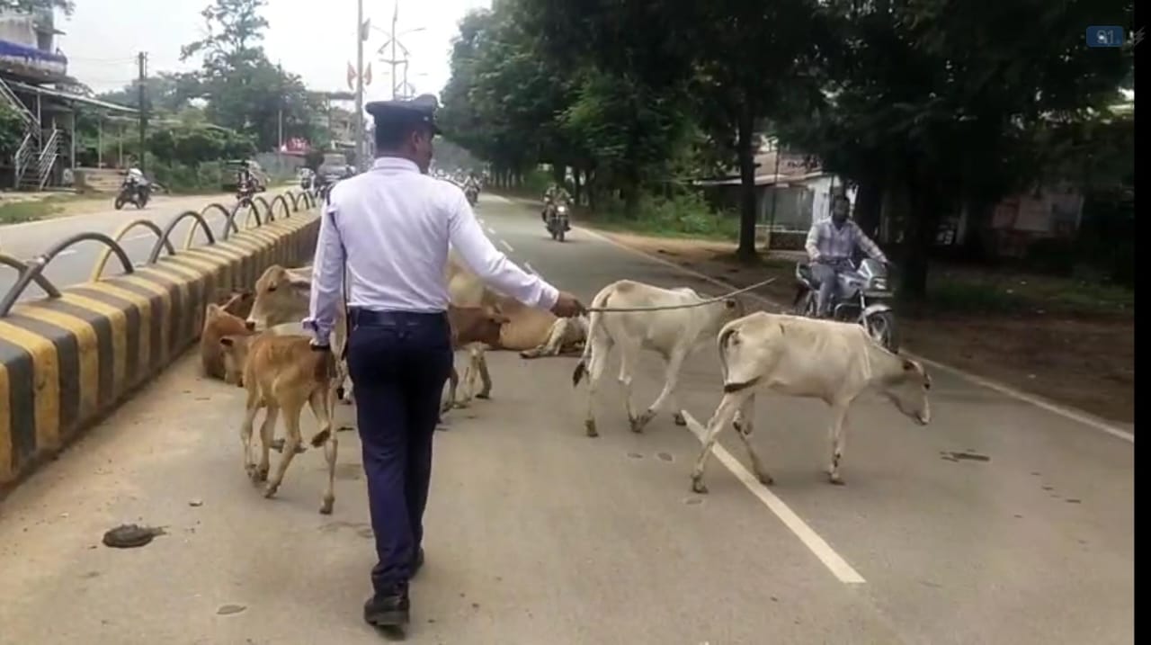 किरंदुल – छत्तीसगढ़ राज्य के सुदूर अंचल दंतेवाड़ा जिले के जिला मुख्यालय से एक दुर्लभ तस्वीर व्हाट्सएप पर खूब वायरल हो रही है । उल्लेखनीय हैं कि दंतेवाड़ा जिला मुख्यालय की मुख्य सड़क पर आये दिन पालतू पशुओं के सड़क के बीचों बीच बैठने से सड़क पर वाहनों की दुर्घटना का खतरा बना रहता है । जो कि कई बार मुख्य सड़क पर पालतू पशुओं से निरंतर हो रही दुर्घटना वाला शीर्षक भी इलेक्ट्रॉनिक मीडिया और प्रिंट मीडिया में प्रमुखता से उठाया जा रहा है ।परंतु उसके बाबजूद भी स्थानीय प्रशासन के नुमाइंदों को इससे कोई असर नहीं पड़ता दिख रहा है । ट्रैफिक पुलिस के कर्मठ जवान के द्वारा सड़क से पालतू पशुओं को हटाने वाला वीडियो साफ तौर पर इस बात को इंगित करता है कि जिस ट्रैफिक पुलिस के जवान की ड्यूटी सड़क पर चल रही वाहनों को व्यवस्थित रूप से संचालित कर नगर में ट्रैफिक व्यवस्था को मजबूत बनाकर सड़क दुर्घटना को रोकना है वो दंतेवाड़ा ट्रैफिक पुलिस का एक जवान सड़क पर दौड़ रही बेतरतीब वाहनों को सही दिशा निर्देश देते हुए सड़क पर बैठे पालतू जानवरों को भी हटाकर सड़क दुर्घटना की कमी को कम करने की कोशिश कर ट्रैफिक पुलिस की जिम्मेदारी को किस तरह मूर्त रूप दे रहा है । एक साथ दो दो जिम्मेदारी को संभालने वाले दंतेवाड़ा मुख्यालय के ट्रैफिक पुलिस के जवानों को स्थानीय जनता के द्वारा व्हाट्सएप के जरिये काफी सराहना मिल रही है ।