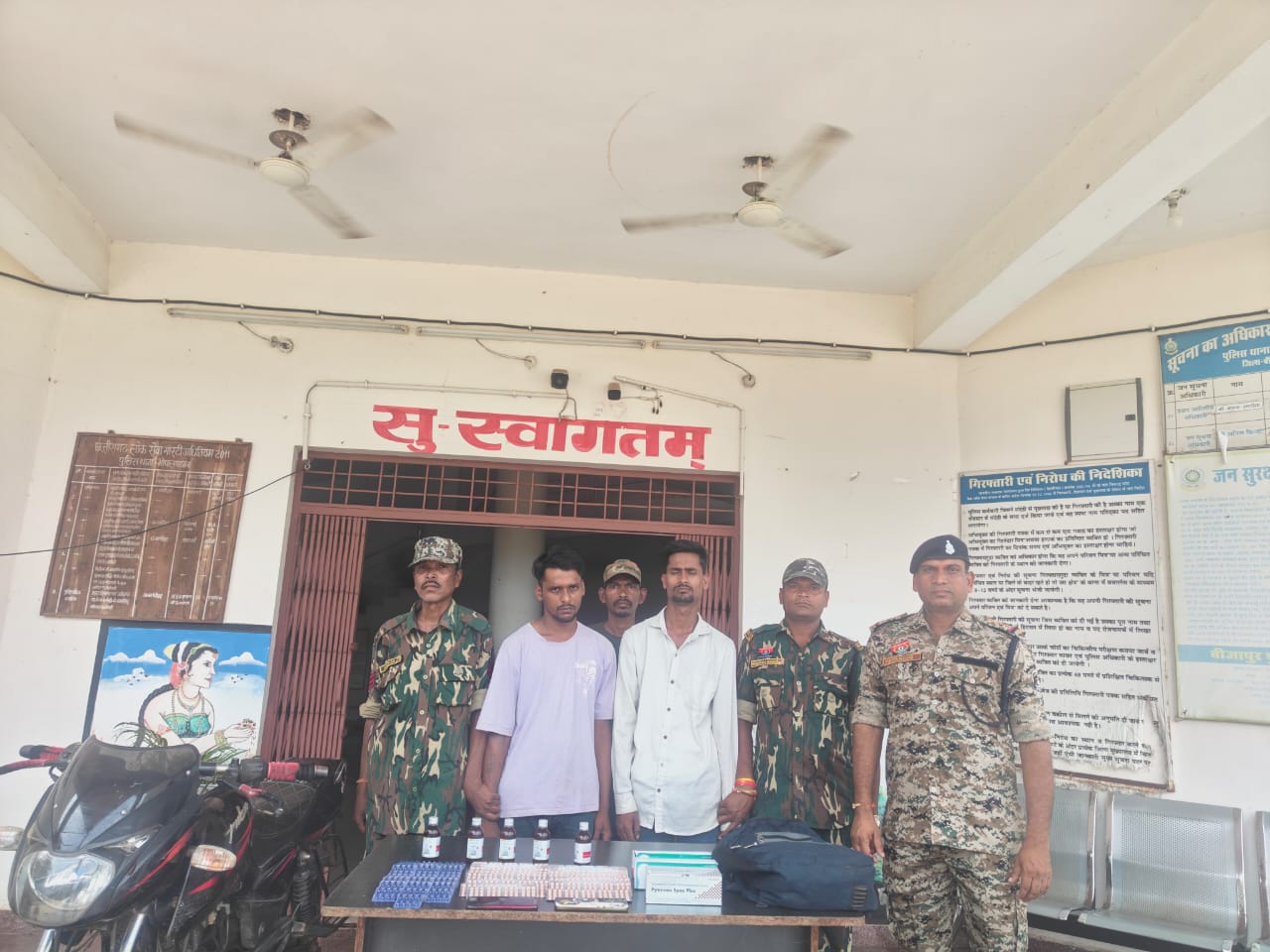 ⏭️दिनांक 12/08/2025 को मुखबीर सूचना पर कार्यवाही करते हुए एक काले रंग के पल्सर में दो संदिग्ध व्यक्तियों के पास से एक काले रंग के बैग में प्रतिबंधित नशीली दवाईयां, स्वापक औषधि मैग्नाटस टी सीरप, अल्प्राजोलेम टेबलेट, पैवीयन स्पासप्लस टेबलेट परिवहन करते हुए बरामद किया गया। पूछताछ करने पर तेलंगाना एटुनगरम से प्रतिबंधित दवाईयां क्रय कर परिवहन करना बताये।