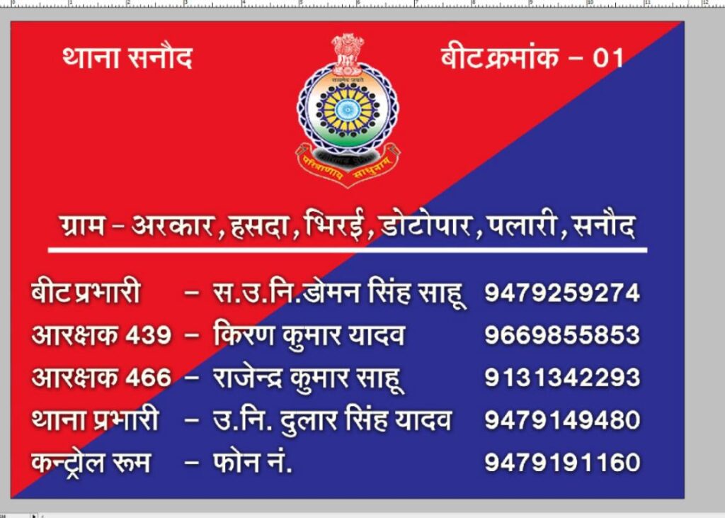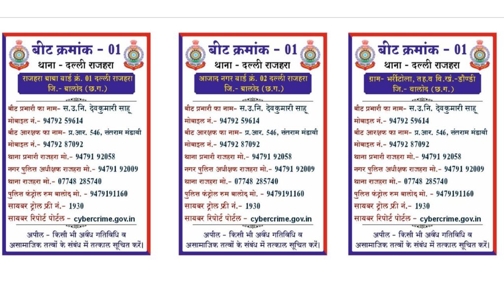 पुलिस अधीक्षक योगेश कुमार पटेल ने जिले के समस्त थाना/चौकी प्रभारियों को बीट सेक्टर अधिकारी, बीट प्रभारी एवं बीट आरक्षक को तैनात कर उनके पद नाम, संपर्क नंबर तथा जिले के पुलिस कंट्रोल रूम नंबर को पोस्टर बनाकर गांव में लगवाने निर्देशित किए हैं जिससे आम जनों को पुलिस के साथ संवाद करने में सुविधा मिल सके।