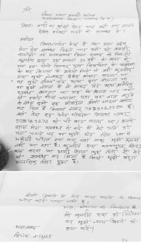 रायगढ़ – जिले के धरमजयगढ़ क्षेत्र से एक दिल दहला देने वाला मामला सामने आया है, जहाँ एक शादीशुदा महिला को प्रेम जाल में फँसाकर चार वर्षों तक शारीरिक शोषण किए जाने का गंभीर आरोप लगा है। अब पीड़िता न्याय की आस में दर-दर की ठोकरें खा रही है और अंततः पुलिस थाना धरमजयगढ़ का सहारा लिया है।पीड़िता ने अपने आवेदन में आरोप लगाया है कि बायसी कॉलोनी निवासी एक युवक, जो धरमजयगढ़ में कंप्यूटर सेंटर संचालित करता है, ने पहले उसे प्रेम के झूठे वादों में फँसाया। युवक ने जीवनभर साथ निभाने का भरोसा दिलाया, मगर विश्वास तोड़ते हुए वर्षों तक उसका शारीरिक शोषण किया।