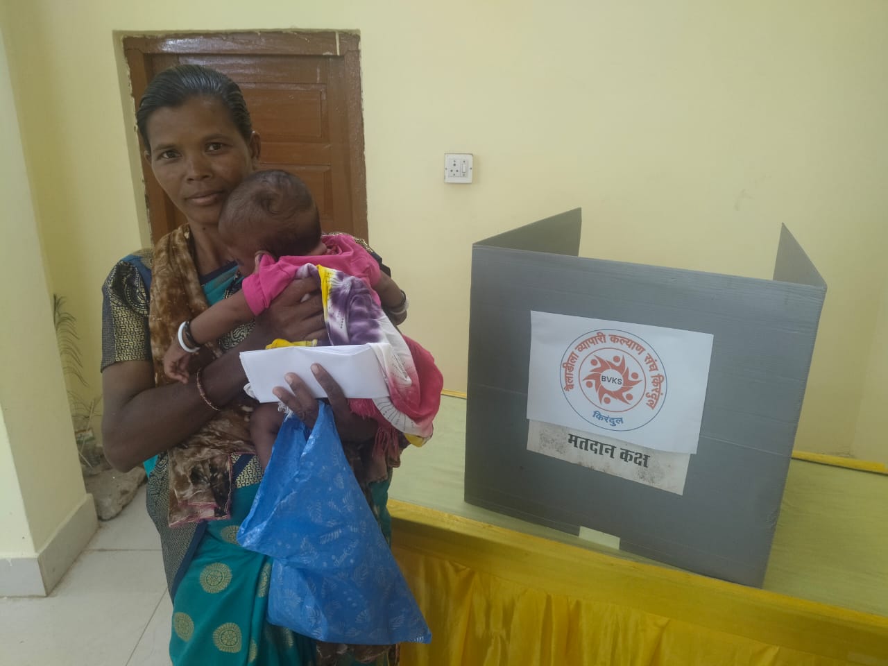 किरंदुल — लोह नगरी किरंदुल में बैलाडीला व्यापारी कल्याण संघ का किरंदुल के छत्तीसगढ़ भवन में प्रातः काल से ही मतदान प्रणाली से मतदान प्रक्रिया जारी है ।विदित हो कि बैलाडीला व्यापारी कल्याण संघ के तत्वाधान में जारी चुनाव में तीन पैनलों के साथ साथ एक अध्यक्ष पद के लिए निर्दलीय प्रत्याशी भी मैदान में अपनी किस्मत आजमा रहे हैं । बैलाडीला व्यापारी कल्याण संघ के चुनावी समर में व्यापारियों में काफी उत्साह देखा जा रहा है । व्यापारी मतदाताओं के उत्साह की बानगी यह है कि किरंदुल नगर के आस पास स्थित आदिवासी ग्रामीण क्षेत्र मदाड़ी की आदिवासी महिला व्यापारी ने अपने दुधमुंहे बच्चे को गोदी में लेकर मतदान स्थल पहुंच कर अपने मत का प्रयोग किया ।जो नगर में चर्चा का विषय बना हुआ है ।