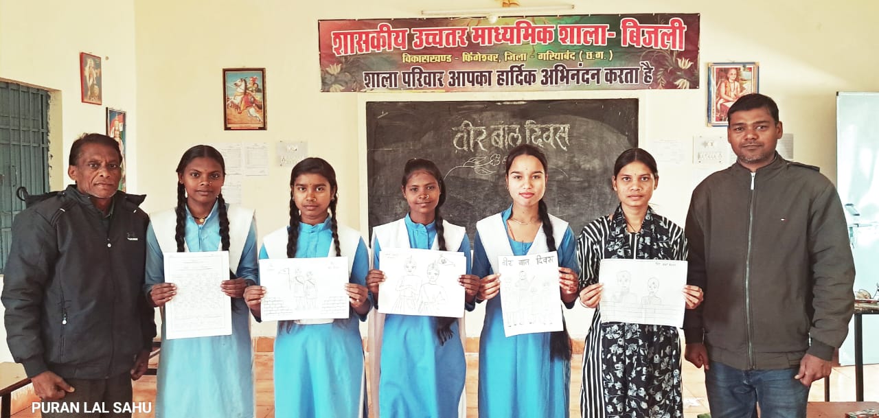 फिंगेश्वर :–भारत सरकार शिक्षा मंत्रालय नई दिल्ली द्वारा विद्यालयों में 26 दिसंबर को वीर बाल दिवस के रूप में मनाए जाने हेतु विभिन्न कार्यक्रम आयोजित करने के निर्देश दिए गए हैं.इसी तारतम्य में शासकीय उच्चतर माध्यमिक विद्यालय बिजली में वीर बाल दिवस कार्यक्रम का आयोजन किया गया. इस अवसर पर व्याख्याता पूरन लाल साहू ने कहा कि वीर बाल दिवस भारत में शौर्य बलिदान और बच्चों की प्रेरणादायक कहानियों को स्मरण करने का एक विशेष दिवस है.यह दिवस उन वीर बालकों के साहस और बलिदान को सम्मानित करने के लिए मनाया जाता है जिन्होंने धर्म, न्याय और सत्य की रक्षा के लिए अपने जीवन का बलिदान दिया खासकर सिख धर्म के इतिहास में साहिबजादों गुरु गोविंद सिंह जी के चार पुत्रों के बलिदान को याद करते हुए यह दिन प्रेरणा का स्रोत बना. उन्होंने आगे राष्ट्र निर्माण में बच्चों की भूमिका पर प्रकाश डालते हुए कहा कि राष्ट्र निर्माण में बच्चों एवं युवाओं की अहम भूमिका होती है. उनमें देश को विकसित करने और प्रगति की ओर ले जाने की शक्ति होती है.वह देश में सामाजिक सुधार लाने के लिए भी जिम्मेदार होते हैं. इसलिए युवाओं को समर्पित,उत्कृष्ट और सक्रिय भूमिका निभाने के लिए प्रेरित किया जाना चाहिए ताकि वह अपने नवाचार, कार्य कुशलता और उत्साह से भारत के विकास को गति दे सके. कार्यक्रम के अंत में भाषण चित्रकला एवं निबंध प्रतियोगिता में भाग लेने वाले स्वाति साहू, जास्मीन साहू, कीर्ति निषाद,सेतुका साहू एवं डिम्पल ढीढी को विद्यालय की ओर से पुरस्कार देकर उनका सम्मान किया गया.इस मौके पर विद्यालय के व्याख्याता पूरन लाल साहू, वरिष्ठ व्याख्याता नरेन्द्र कुमार वर्मा क्लर्क दुष्यंत कुमार साहू उपस्थित थे.
