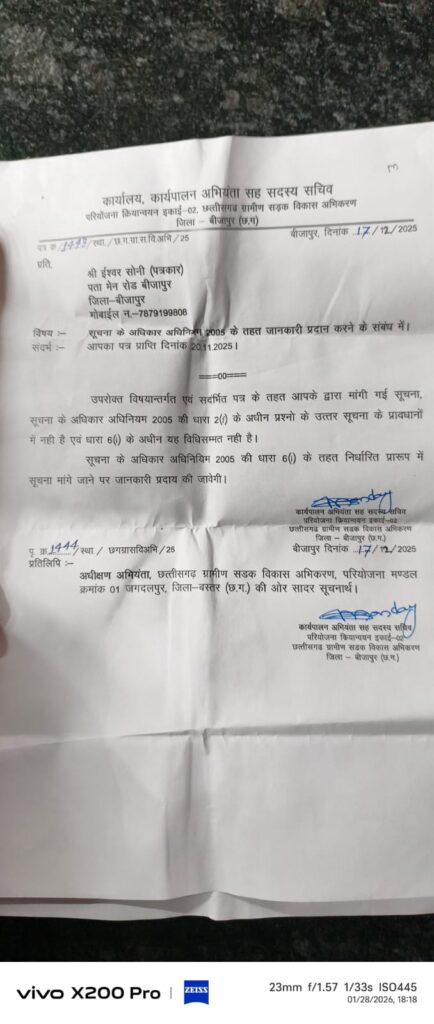 बीजापुर – प्रधानमंत्री ग्राम सड़क योजना (PMGSY) से जुड़ी जानकारी मांगने पर विभाग द्वारा स्पष्ट सूचना देने के बजाय कानूनी धाराओं का हवाला देकर जवाब टालने का मामला सामने आया है। इससे सूचना के अधिकार अधिनियम की मंशा पर सवाल खड़े हो रहे हैं।
