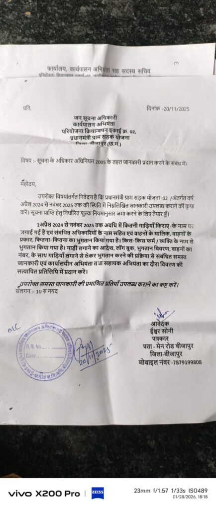 पत्रकार ईश्वर सोनी द्वारा 20 नवंबर 2025 को सूचना के अधिकार अधिनियम 2005 के तहत एक आवेदन प्रस्तुत किया गया था। आवेदन में अप्रैल 2024 से नवंबर 2025 तक PMGSY अंतर्गत किराये पर लगाई गई गाड़ियों से जुड़ी विस्तृत जानकारी मांगी गई थी। इसमें अधिकारियों के नाम, वाहन मालिक, वाहन का प्रकार, किराया भुगतान विवरण, आदेश प्रति, लॉगबुक, भुगतान प्रक्रिया और संबंधित दस्तावेजों की प्रमाणित प्रतियां शामिल थीं।