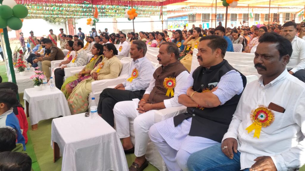 सर्वप्रथम किरंदुल नगर पालिका परिषद की अध्यक्ष रूबी सिंह ,मुख्य नगर पालिका अधिकारी शशि भूषण महापात्र , आर्सेलर मित्तल निप्पन स्टील कंपनी किरंदुल के महाप्रबंधक कल्याण ,आर्सेलर मित्तल कंपनी के सीएसआर प्रमुख डॉ तेजप्रकाश ,किरंदुल थाना प्रभारी संजय यादव , बैलाडीला ठेकेदार संघ के अध्यक्ष अतुल सिंह ,पूर्व पालिकाध्यक्ष शैलेंद्र सिंह ,किरंदुल चैंबर ऑफ कॉमर्स के कार्यालय सचिव राजेश वेप्रल राव ,पार्षद गोपीनाथ ,पार्षद राजकुमार सोनी ,पार्षद रूपा रानी ने भारत माता के तैलचित्र पर दीप प्रज्वलित कर मलार्यपन किया ।मुख्य अतिथि और विशिष्ट अतिथियों के पुष्प गुच्छ से स्वागत पश्चात नगर के शासकीय स्कूलों के छात्र छात्राओं के द्वारा देश भक्ति से ओतप्रोत नृत्यों की प्रस्तुति दी गई ।