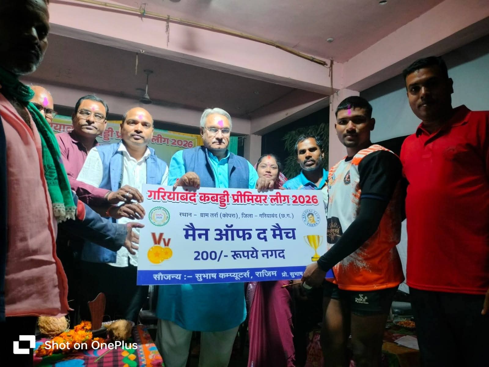 राजिम – गरियाबंद कबड्डी प्रीमियर लीग 2026 ग्राम तर्रा में दो दिवसीय 31 जनवरी व 1 फरवरी 2026 को कबड्डी खेल का आयोजन किया जा रहा है।जिसमें मुख्य अतिथि के रूप में संदीप शर्मा अध्यक्ष छत्तीसगढ़ खाद्य आयोग ने सभी खिलाड़ियों को खेल भावना के साथ खेलने को कहा कबड्डी खेल पावर के साथ शरीर मे फुर्ती के साथ खेला जाने वाला खेल है सभी खिलाड़ियों व आयोजक समिति को बधाई शुभकामनाएं व्यक्त किये।