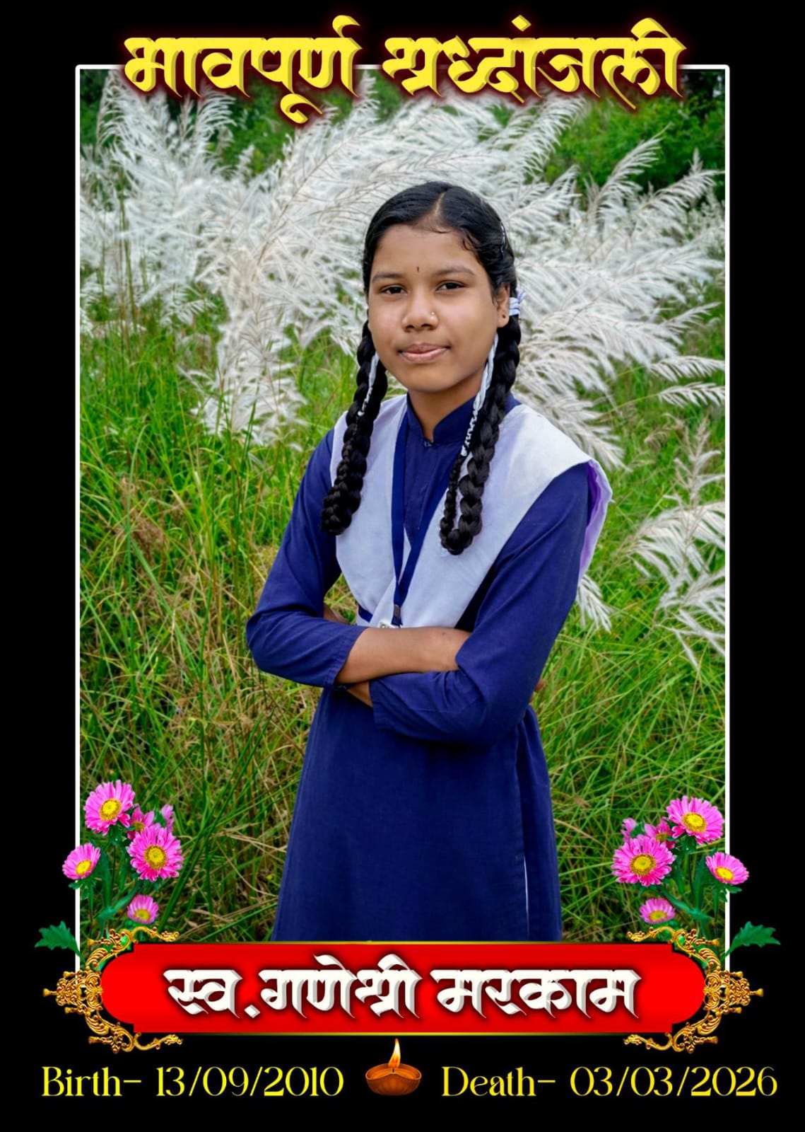 मिली जानकारी के अनुसार हायर सेकेण्डरी स्कूल शोभा कक्षा 11 वीं मे अध्ययनरत छात्रा कु. गणेश्वरी मरकाम का पिछले एक सप्ताह से तबियत खराब हो गई थी और उनका उपचार शोभा मैनपुर क्षेत्र के अस्पताल मे किया जा रहा था राजापडा़व क्षेत्र के ग्राम ढोलसराई निवासी कुमारी गणेश्वरी मरकाम पिता मानसिंह मरकाम जाति गोंड़ उम्र लगभग 16 वर्ष शोभा हाईस्कूल मे कक्षा 11वीं में अध्यनरत थी जिनका तबियत खराब होने के कारण तीन दिन पूर्व 28 फरवरी को गुप्ता हॉस्पिटल धमतरी में ईलाज के लिए भर्ती कराया गया था। इलाज के आज सोमवार रात को कक्षा 11 वीं छात्रा ने दम तोड़ दिया आज मंगलवार को सुबह धमतरी से शव को गृह ग्राम ढोलसराई लाया गया है। अंतिम यात्रा में क्षेत्र के वरिष्ठ लोग व स्थानीय ग्रामीण बड़ी संख्या मे शामिल हुए तथा क्षेत्र मे शोक की लहर देखने को मिल रहा है।
