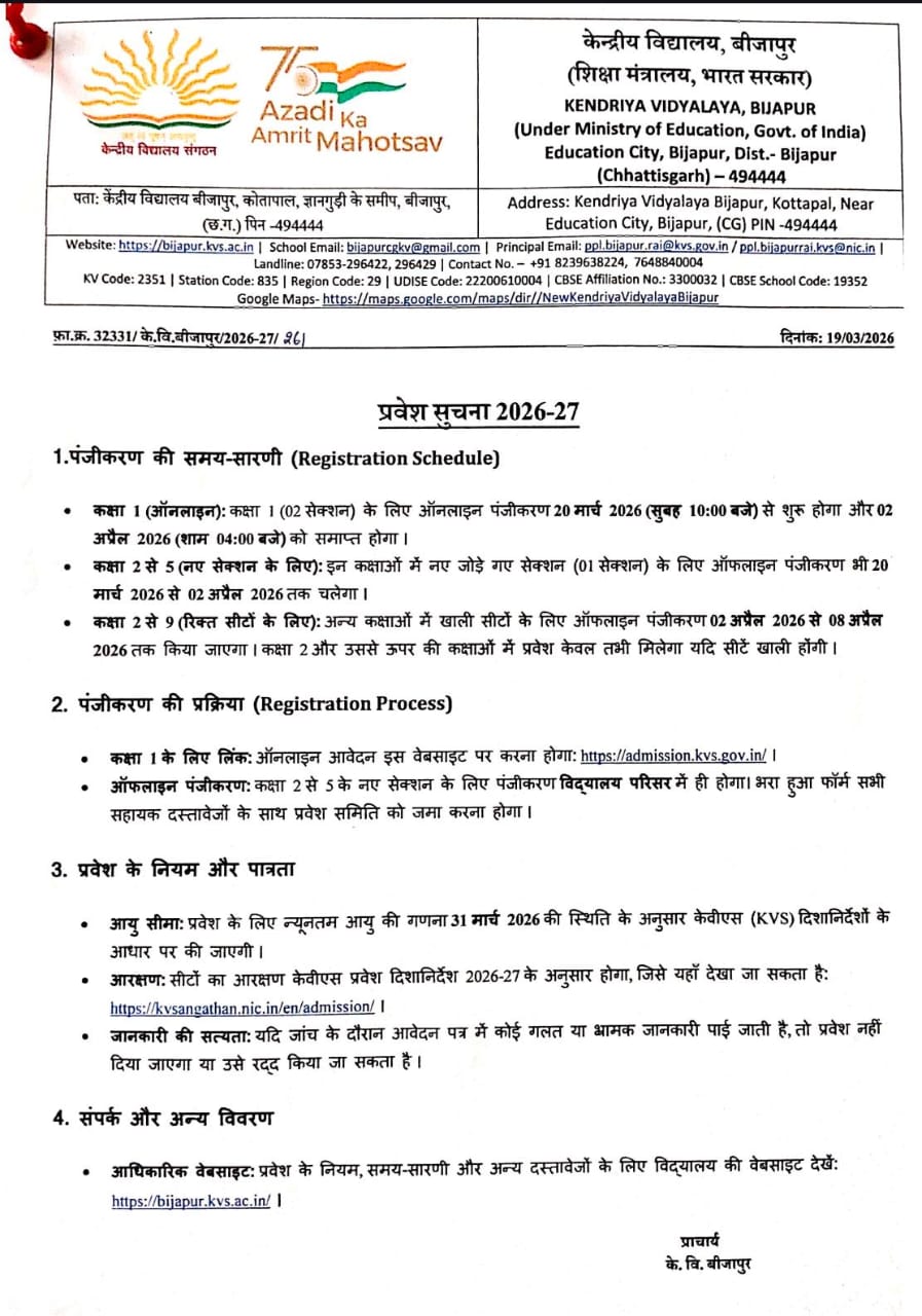 बीजापुर – केन्द्रीय विद्यालय बीजापुर में नए सत्र 2026-27 के लिए कक्षा पहली से पांचवीं तक प्रवेश प्रारंभ हो गया है। कक्षा प्रथम में 80 सीटो पर प्रवेश हेतु ऑनलाइन पंजीयन करना होगा। एवं कक्षा दूसरी से पांचवीं तक प्रवेश (प्रत्येक कक्षा में 40 सीट) हेतु विद्यालय में आकर ऑफलाइन पंजीयन करना होगा। वहीं 20 मार्च 2026 प्रातः 10 बजे से पंजीयन की अंतिम तिथि, 02 अप्रैल 2026 दोपहर 1ः00 बजे तक निर्धारित है। अभी अभिभावकों के पास अपने पाल्य/पाल्या को एक अच्छे विद्यालय में पढ़ाने का सुनहरा अवसर। इच्छुक अभिभावक समय पर प्रवेश हेतु पंजीयन करवा सकते है।