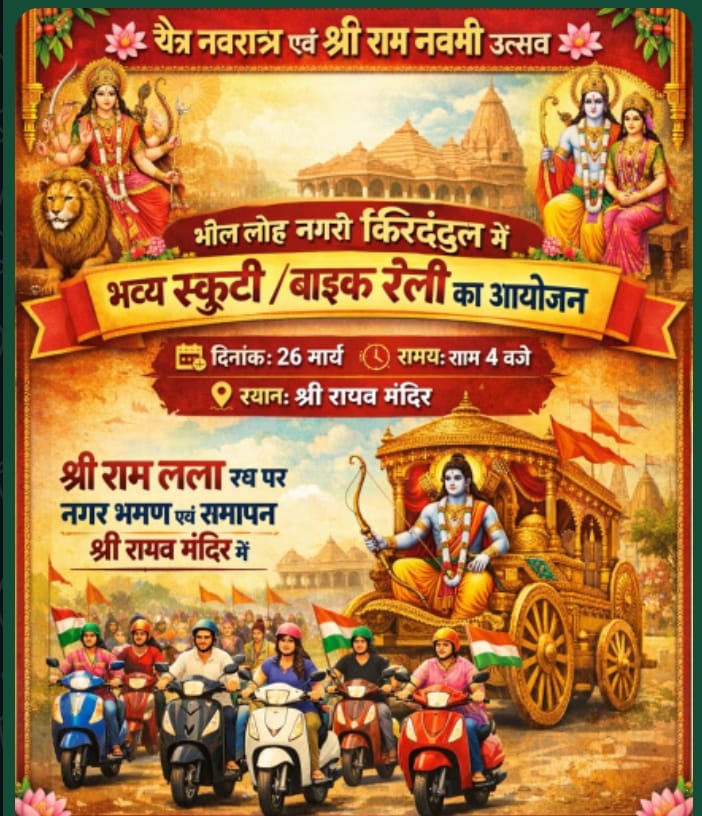 किरंदुल — चैत्र नवरात्रि एवं श्री राम नवमी के पावन पर्व पर प्रति वर्षो की ही भांति इस वर्ष भी हिन्दू नववर्ष एवं राम नवमी आयोजन समिति के तत्वाधान में लौह नगरी किरंदुल में नगर के हृदय स्थल पर किरंदुल वासियों के आस्था के प्रमुख केंद्र श्री राघव मंदिर से भव्य स्कूटी और बाइक रैली का आयोजन आज गुरुवार को संध्या 4बजे से किया जाएगा । हिन्दू नववर्ष और राम नवमी आयोजन समिति के द्वारा आयोजित स्कूटी और बाइक रैली श्री राघव मंदिर से प्रारंभ हो कर पूरे किरंदुल नगरी का भृमण करते हुए वापिस श्री राघव मंदिर पहुँचेगी । इस दौरान श्री राम लल्ला विशाल रथ पर सवार हो कर नगरवासियों को दर्शन देंगे ।