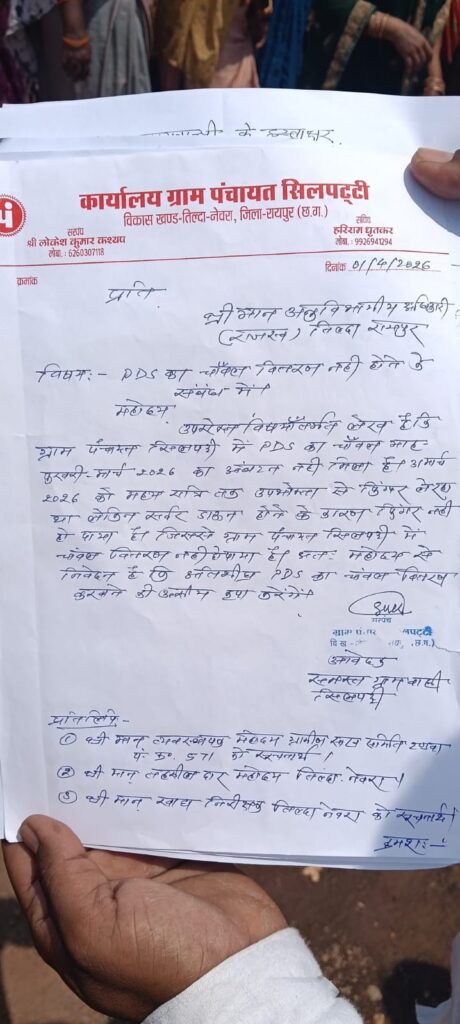 तिल्दा नेवरा — महिलाओं ने सेल्समेन की शिकायत करते हुए बताया की कई महीनों से शक्कर और नमक नहीं दिया है कुछ बोलने पर उसके द्वारा अभद्रता किया जाता है बोलता है की जो करना है कर लो -गरीबों की थाली भरने वाली सरकारी राशन व्यवस्था रायपुर जिले के तिल्दा ब्लॉक में सवालों के घेरे में है. ग्राम पंचायत सिलपट्टी में सैकड़ों परिवार ऐसे हैं. जिनकी रसोई महीनों से सरकारी चावल का इंतजार कर रही है.. इसका खुलासा तब हुआ जब पंचायत के सैकड़ों लोग अनुविभागीय अधिकारी से राशन की मांग करने कार्यालय पहुंचे और उन्होंने राशन व्यस्था सुधारने की मांग की है.