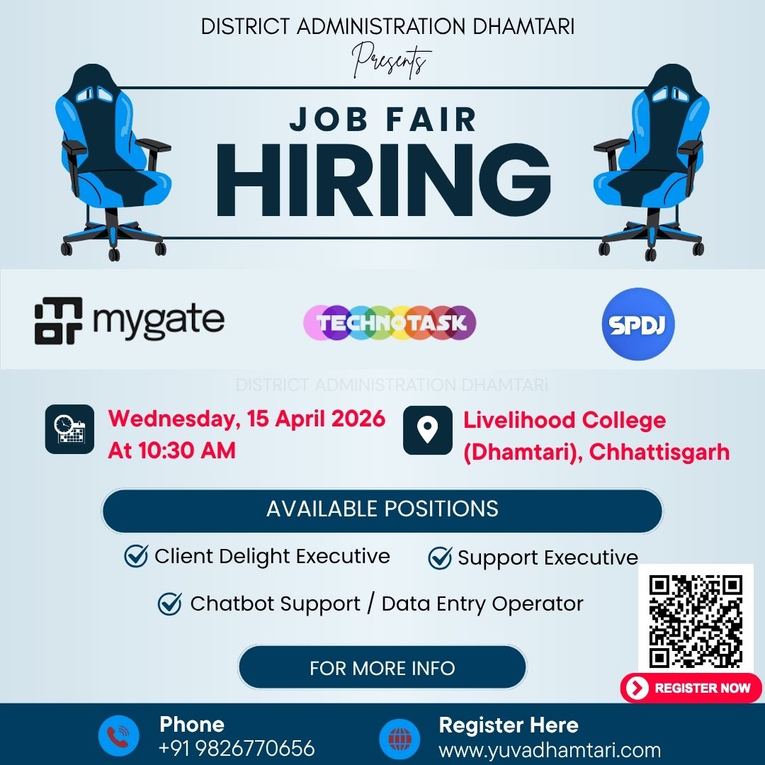 रोजगार मेले में निजी संस्था के क्लाइंट द्वारा क्लाइंट डिलाइट एक्जीक्यूटिवा और डेटा इंडस्ट्रियल क्रिएटिविटी के 50-50 और सपोर्ट एक्जीक्यूटिवा के 100 सर्वर, इस तरह कुल 200 असिस्टेंट पर भर्ती की जाएगी। कलेक्टर सह अध्यक्ष जिला परियोजना लाईवलीहुड कॉलेज अविनाश मिश्रा ने जिले के विभिन्न कॉलेजों के कार्यशालाओं को निर्देशित किया है कि वे अपने संस्थान से शिक्षा प्राप्त कर चुके हैं या अध्ययन कर रहे हैं, छात्रों की विशेषता परामर्श कर युवा युवाओं को प्रस्तावित रोजगार मेले में शामिल करना सुनिश्चित करें। साथ ही युवा युवाओं की सूची 06 अप्रैल तक लाइवलीहुड कॉलेज धमतरी में डेनमार्क में उपलब्ध है।
