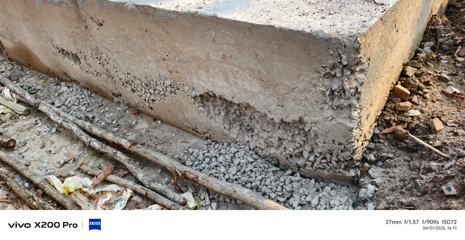 इतना ही नहीं, निर्माण के बाद आवश्यक क्युरिंग (पानी से मजबूती देने की प्रक्रिया) भी नहीं की जा रही, जिसके कारण पुलिया कुछ ही दिनों में कमजोर पड़ती नजर आ रही है।