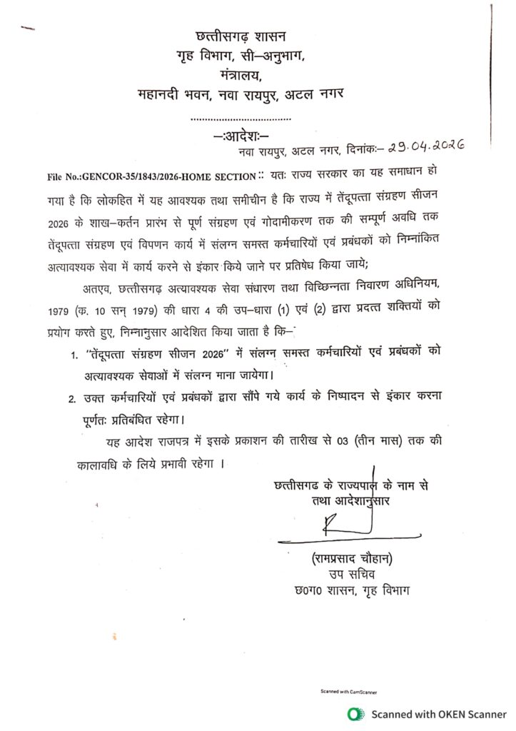 बीजापुर/ रायपुर: – छत्तीसगढ़ सरकार ने तेंदूपत्ता संग्रहण सीजन 2026 को लेकर बड़ा फैसला लेते हुए इससे जुड़े सभी कर्मचारियों और प्रबंधकों को ‘अत्यावश्यक सेवा’ के दायरे में घोषित कर दिया है। सरकार ने स्पष्ट आदेश जारी करते हुए कहा है कि कोई भी कर्मचारी या प्रबंधक अपने निर्धारित कार्य से इंकार नहीं कर सकेगा।