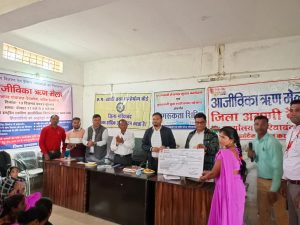 गरियाबंद :- जिला प्रशासन के मार्गदर्शन में जिले के अग्रणी बैंक के तत्वाधान में विगत दिवस देवभोग में आजीविका ऋण मेला का आयोजन किया गया। ऋण मेला में हितग्राहियों को विभिन्न ऋण योजनाओं से लाभान्वित करने के साथ ही वित्तीय धोखाधड़ी से बचने के उपाय की जानकारी दी गई। ऋण मेला में 2 करोड़ 60 लाख 58 हजार की राशि का ऋण स्वीकृत किया गया। शिविर में एनआरएलएम अंतर्गत 89 प्रकरणों में 1 करोड़ 68 लाख रूपये ऋण स्वीकृत की गई। प्रधानमंत्री रोजगार सृजन कार्यक्रम के अंतर्गत 1 प्रकरण में 3 लाख रूपये, मुद्रा योजना के 2 प्रकरण में 3 लाख, अंत्यावसायी के 9 प्रकरणों में 1 लाख 60 हजार रूपये लोन, 18 लोगों के लिए 28 लाख 18 हजार रूपये की केसीसी, एमएसएमई के 2 प्रकरणों में 50 लाख रूपये एवं पीएल के 1 प्रकरण में 1 लाख 80 हजार रूपये का ऋण लाभ प्रदाय किया गया। इसी प्रकार प्रधानमंत्री सुरक्षा बीमा योजना अंतर्गत 1, प्रधानमंत्री जीवन ज्योति योजना में 2 प्रकरणों में कुल 6 लाख रूपये का डेथ क्लेम प्रदान किया गया। साथ ही प्रधानमंत्री जीवन ज्योति योजना के 15, प्रधानमंत्री सुरक्षा बीमा योजना के 29 एवं अटल पेंशन योजना के 1 आवेदन स्वीकृत किये गये। इस प्रकार कुल 2 करोड़ 60 लाख 58 हजार का ऋण आजीविका ऋण मेला में स्वीकृत किया गया।