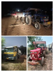 आज कलेक्टर प्रभात मलिक के निर्देश पर आज ग्राम लाफिनखुर्द से 2 ट्रेक्टर रेत का तथा तुमगांव मे 1 ट्रेक्टर रेत एवम 1 हाइवा चुनापत्थर का अवैध परिवहन करते जप्त किया गया है.जिसे सबंधित पुलिस थाना में रखा गया है।