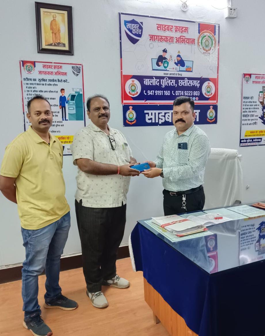 बालोद :- पुलिस द्वारा साइबर मड़ई के तहत बालोद जिला के लोगों को जागरुक किया जा रहा है इसका असर अब दिखने लगा है लोग मोबाइल गुम जाने से CEIR पोर्टल का उपयोग करने लगे हैं इसी तत्वाधान में थाना बालोद में मोबाईल गुम रिपोर्ट CEIR PORTAL के माध्यम से प्राप्त हुई जिसे साइबर सेल बालोद द्वारा मोबाईल को ढुंढकर आज 09.02.2024 को मोबाईल धारक को सुपुर्द किया गया। मोबाइल धारक द्वारा बालोद पुलिस को धन्यवाद ज्ञापित किया गया।बालोद पुलिस लगातार इस प्रकार पोर्टल के माध्यम से मिलने वाले रिपोर्ट पर लगातार कार्यवाही कर रही है ।