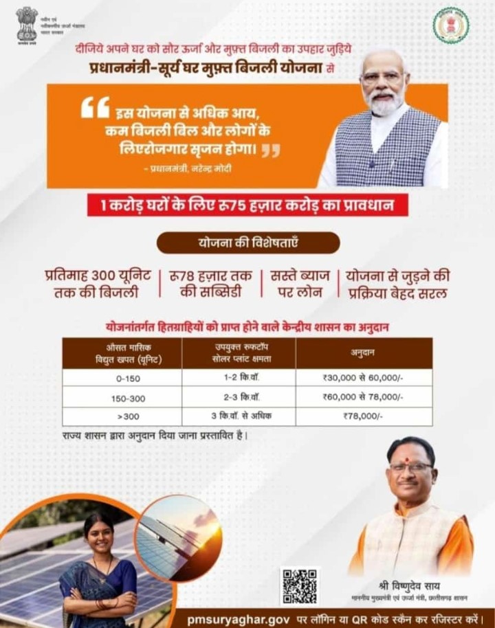 बालोद :- भारत शासन द्वारा प्रधानमंत्री सूर्य घर मुफ्त बिजली योजना के अंतर्गत देश के एक करोड़ घरों के छतों पर सौर पैनल स्थापना का लक्ष्य रखा गया है। प्रधानमंत्री सूर्य घर मुफ्त बिजली योजना के अंतर्गत प्रति माह 300 यूनिट तक मुफ्त बिजली प्रदान की जाएगी। इसके साथ ही 78000 तक की अधिकतम सब्सिडी तथा सस्ते ब्याज पर लोन भी प्रदान की जाएगी। क्रेडा के जिला प्रभारी ने बताया कि इस योजना के अंतर्गत शहरी स्थानीय निकायों और पंचायतों को भी अपने अधिकार क्षेत्र में छत पर सौर प्रणाली को बढ़ावा देने के लिए प्रोत्साहित किया जाएगा। उन्होंने बताया कि प्रधानमंत्री सूर्य घर मुफ्त बिजली योजना से अधिक आय, कम बिजली और नवीन रोजगार सृजन होगा तथा नवीनीकृत ऊर्जा स्त्रोत के प्रति जागरूकता बढ़ेगी। उन्हांेने बताया कि छतों पर सौर पैनल स्थापना हेतु हितग्राहियों को प्राप्त होने वाले अनुदान के अंतर्गत रूफटाॅप सोलर प्लांट की क्षमता 01 से 02 किलोवाॅट तथा 0 से 150 यूनिट विद्युत खपत होने पर 30 हजार से 60 हजार रूपये की राशि का अनुदान प्रदान की जाएगी। इसी तरह रूफटाॅप सोलर प्लांट की क्षमता 2 से 3 किलोवाॅट तथा 150 से 300 यूनिट विद्युत खपत होने पर 60 हजार से 78 हजार रूपये की अनुदान प्रदान की जाएगी। इसी तरह रूफटाॅप सोलर प्लांट की क्षमता 03 किलोवाॅट तथा 300 यूनिट से अधिक विद्युत खपत होने पर 78 हजार रूपये की अनुदान प्रदान की जाएगी।