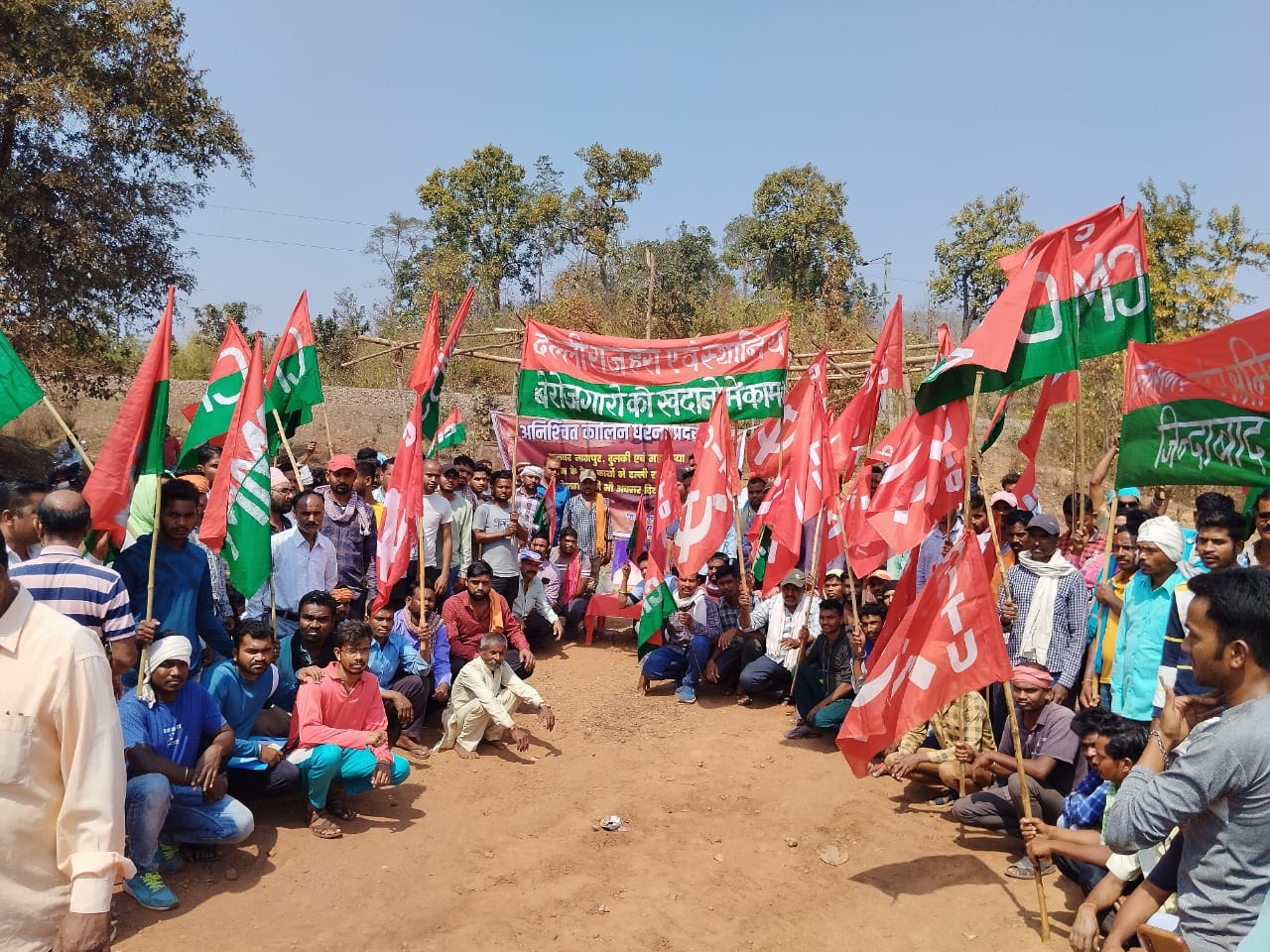 दल्ली राजहरा – आज दल्ली राजहरा के बेरोजगारों के द्वारा संयुक्त यूनियन जिसमें छत्तीसगढ़ माइंस श्रमिक संघ (सीएमएसएस) हिंदुस्तान स्टील एम्प्लाईज यूनियन ( सीटू ) और संयुक्त खदान मजदूर संघ ( एटक ) के बैनर तले आज दल्ली राजहरा से महामाया माइंस जाने वाली रोड पर चोरहा पड़ाव के आगे रेल्वे ओवर ब्रिज के पास अनिश्चित कालीन शांतिपूर्ण धरना प्रदर्शन प्रारंभ किया गया l प्रदर्शन स्थल पर कामरेड विनोद मिश्रा ने कहा कि दल्ली खदान समुह के सभी ठेका कार्यों में आसपास के सभी ग्रामों के लोगों को बिना किसी भेदभाव किये काम में लिया गया है। दल्ली राजहरा के साथियों के द्वारा इन्हें अपनापन और भाईचारे की भावना से देखा जाता है l हमारे द्वारा कोई भेदभाव नहीं किया जा रहा है l जबकि स्थानीय कलवर नागुर दुलकी और महामाया माइंस में काम जब से चालू हुआ है वहां के ठेका कार्यों में दल्ली राजहरा के बेरोजगारों को काम में नहीं लिया जा रहा है। हम इसका विरोध करते हैं l