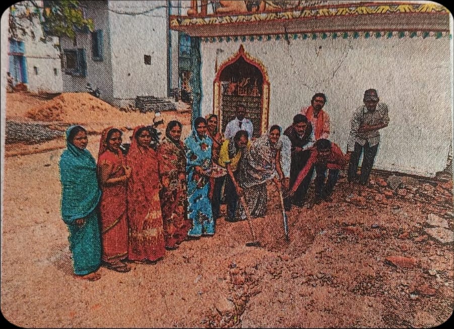 सार्वजनिक भवन निर्माण के पूर्व भूमि पूजन करते हुए सरपंच, पंच व ग्रामीण।