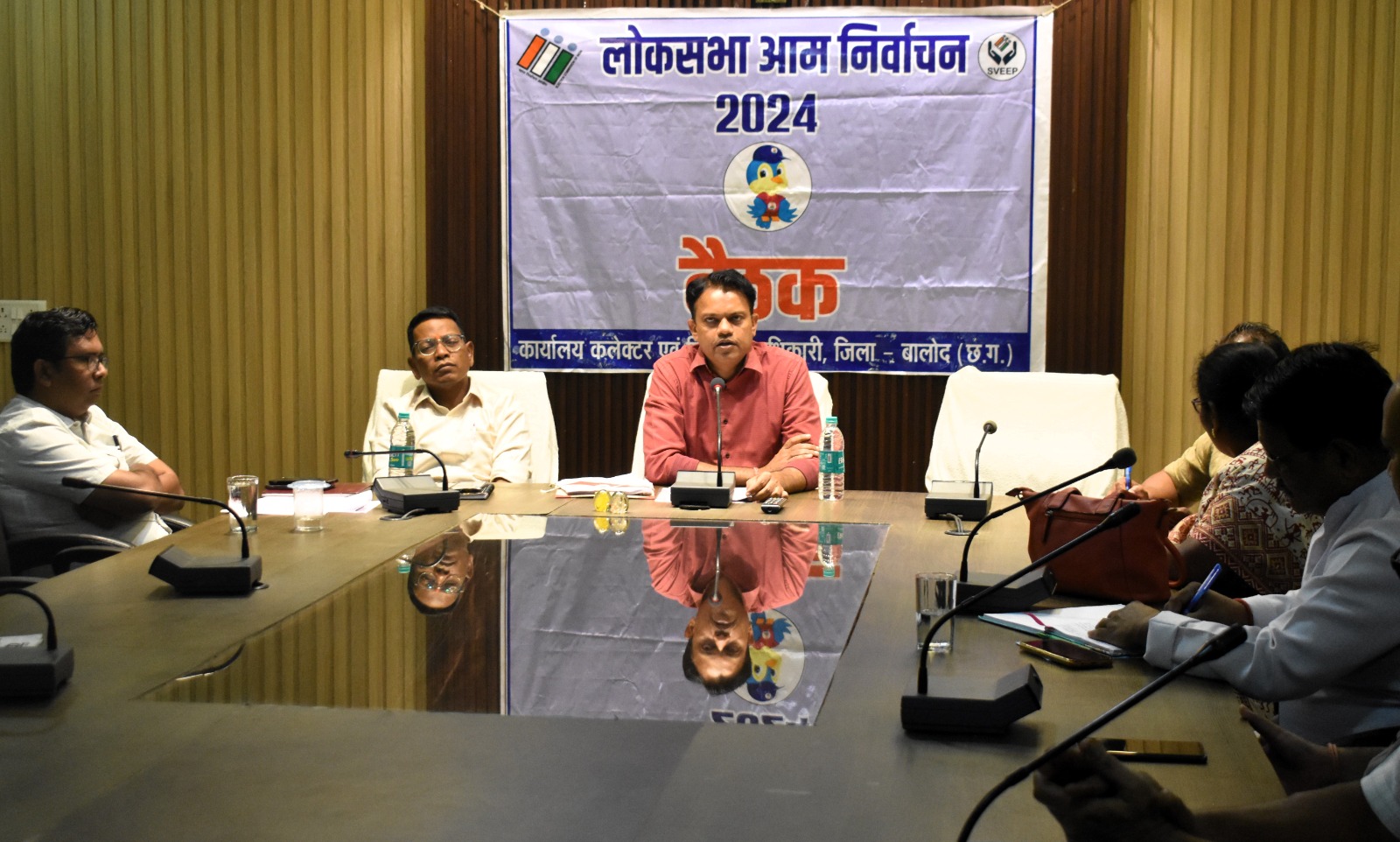 बालोद :- कलेक्टर एवं जिला निर्वाचन अधिकारी इन्द्रजीत सिंह चन्द्रवाल ने आज संयुक्त जिला कार्यालय सभाकक्ष में जिले के मान्यता प्राप्त राजनैतिक दलों के प्रतिनिधियों की बैठक ली। इस दौरान उन्होंने लोकसभा आम निर्वाचन 2024 के अंतर्गत शनिवार 16 मार्च से आदर्श आचार संहिता प्रभावशील होने के पश्चात् भारत निर्वाचन आयोग द्वारा जारी किए गए दिशा-निर्देशों का शत प्रतिशत पालन सुनिश्चित करते हुए जिले में स्वतंत्र, निष्पक्ष एवं शांतिपूर्ण ढंग से निर्वाचन संपन्न कराने में सहयोग करने की अपील की। बैठक में पुलिस अधीक्षक श्री सूरजन राम भगत, उप जिला निर्वाचन अधिकारी चन्द्रकांत कौशिक एवं जिले के मान्यता प्राप्त राजनैतिक दलों के प्रतिनिधिगण उपस्थित थे। बैठक में श्री चन्द्रवाल ने राजनैतिक दल के प्रतिनिधियों को लोकसभा आम निर्वाचन कार्यक्रम के अंतर्गत भारत निर्वाचन आयोग द्वारा जारी किए गए दिशा-निर्देशों के संबंध में विस्तारपूर्वक जानकारी दी।