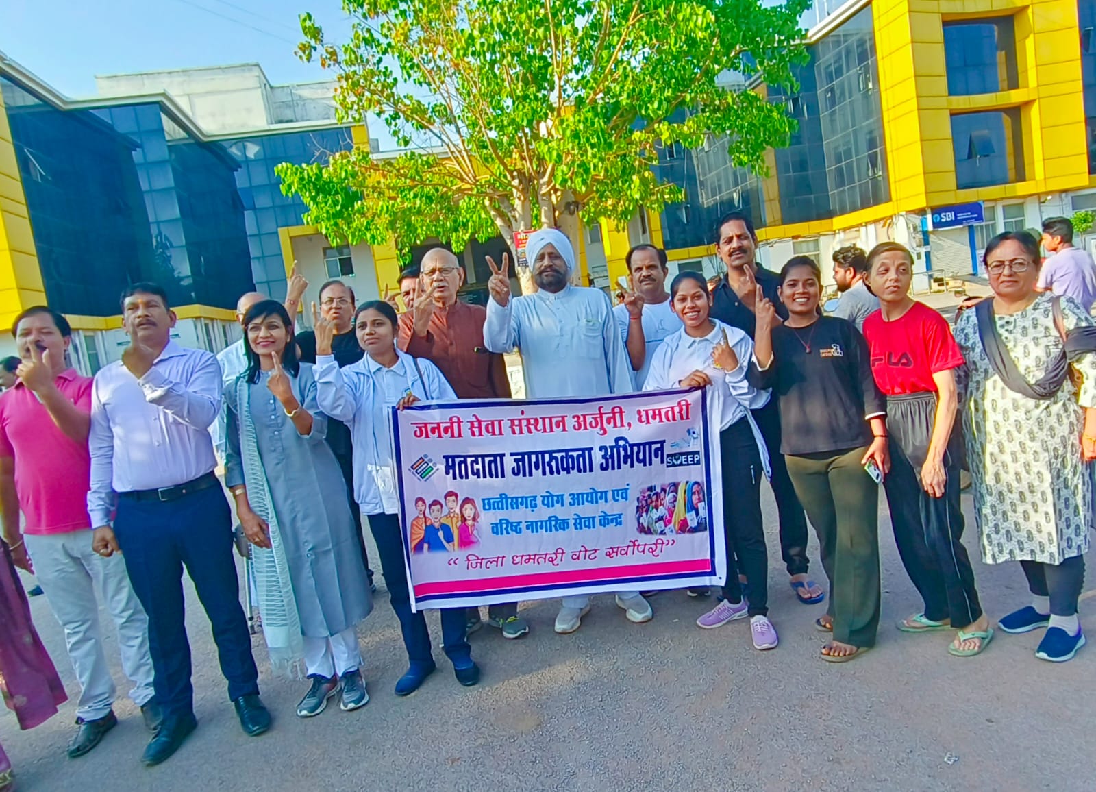 धमतरी:- कलेक्टर एवं जिला निर्वाचन अधिकारी सुश्री नम्रता गाधी के निर्देश और सीईओ जिला पंचायत तथा स्वीप जिला नोडल अधिकारी सुश्री रोमा श्रीवास्तव के मार्गदर्शन में जिले में अनेक स्वीप गतिविधियां चलाई जा रहीं हैं। इसी कड़ी में आज जननी सेवा संस्थान अर्जुनी, छ.ग. योग आयोग एवं वरिष्ठ नागरिक सेवा केन्द्र द्वारा विकास के भविष्य पर दांव लगाएं सही उम्मीदवार को हमेशा चुनाव जिताएं का संदेश देते हुए रैली निकाली गई। दिव्यांगजन, वृद्धजन सहित जनसामान्य द्वारा निकाली गई इस रैली को कम्पोजिट भवन के पास से स्वीप जिला नोडल अधिकारी सुश्री श्रीवास्तव ने हरी झण्डी दिखाकर रवाना किया। यह रैली कम्पोजिट भवन, जनपद पंचायत होते हुए फिर कम्पोजिट भवन पर सम्पन्न हुई। इस अवसर पर उप संचालक समाज कल्याण विभाग अखिलेश्वर तिवारी द्वारा उपस्थितों को मतदान की शपथ भी दिलाई गई। शपथ में कहा कि हम भारत के नागरिक, लोकतंत्र में अपनी पूर्ण आस्था रखते हुए यह शपथ लेते हैं कि हम अपने देश की लोकतांत्रिक परम्पराओं की मर्यादा को बनाए रखेंगे तथा स्वतंत्र, निष्पक्ष एवं शांतिपूर्ण निर्वाचन की गरिमा को अक्षुण्ण रखते हुए निर्भीक होकर, धर्म, वर्ग, जाति, समुदाय, भाषा अथवा अन्य किसी भी प्रलोभन से प्रभावित हुए बिना सभी निर्वाचनों में अपने मताधिकार का प्रयोग करेंगे।