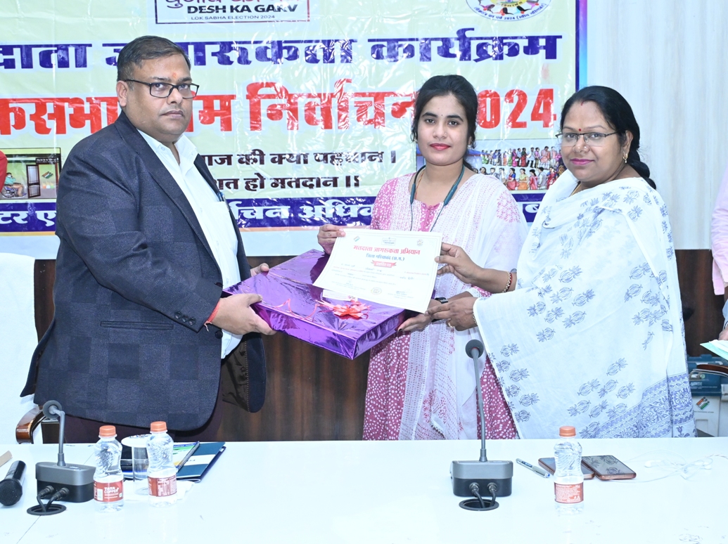 गरियाबंद :- लोकसभा निर्वाचन 2024 चुनाव का पर्व देश का गर्व अंतर्गत जिले में शत प्रतिशत मतदान सुनिश्चित हो सके, इसके लिए कलेक्टर एवं जिला निर्वाचन अधिकारी दीपक कुमार अग्रावल के निर्देश पर मतदाता जागरूकता अभियान लगातार चलाया जा रहा है। इसी कड़ी में जिले के प्रतिभागियों से 20 मार्च से 05 अप्रैल तक पेंटिंग, नारा लेखन तथा फोटोग्राफी की आनलाईन प्रतियोगिता का आयोजन किया गया था। जिसमें प्रथम, द्वितीय एवं तृतीय स्थान प्राप्त करने वाले सर्वश्रेष्ठ प्रतिभागियों को कलेक्टर एवं जिला निर्वाचन अधिकारी दीपक अग्रवाल और स्वीप के नोडल अधिकारी एवं जिला पंचायत सीईओ श्रीमती रीता यादव ने पुरस्कार एवं प्रशस्ति पत्र देकर सम्मानित किया। इनमें पेंटिंग प्रतियोगिता में प्रथम स्थान पर कुमारी हिमांशी त्रिपाठी, द्वितीय निधि विश्वकर्मा एवं त ृतीय स्थान पर दीक्षा साहू रही। इसी प्रकार नारा लेखन प्रतियोगिता में प्रथम स्थान पर उमेश्वरी साहू, द्वितीय स्थान पर रामानंद अग्रवाल एवं तृतीय स्थान पर केश्वर्या सिन्हा रही। इसके अलावा फोटो प्रतियोगिता में प्रथम स्थान पर उमेश्वरी साहू एवं द्वितीय स्थान पर खोमन सिन्हा रहे। इस अवसर पर कलेक्टर श्री अग्रवाल ने सर्वश्रेष्ठ प्रतिभागियों को मतदाता संकल्प हैंड बैंड पहनाकर मतदान करने तथा अपने घर-परिवार एवं पड़ोसियों को मतदान दिवस 26 अप्रैल को मतदान करने के लिए प्रेरित करने को कहा। इस अवसर पर उप जिला निर्वाचन अधिकारी राकेश कुमार गोलछा सहित मौजूद थे।