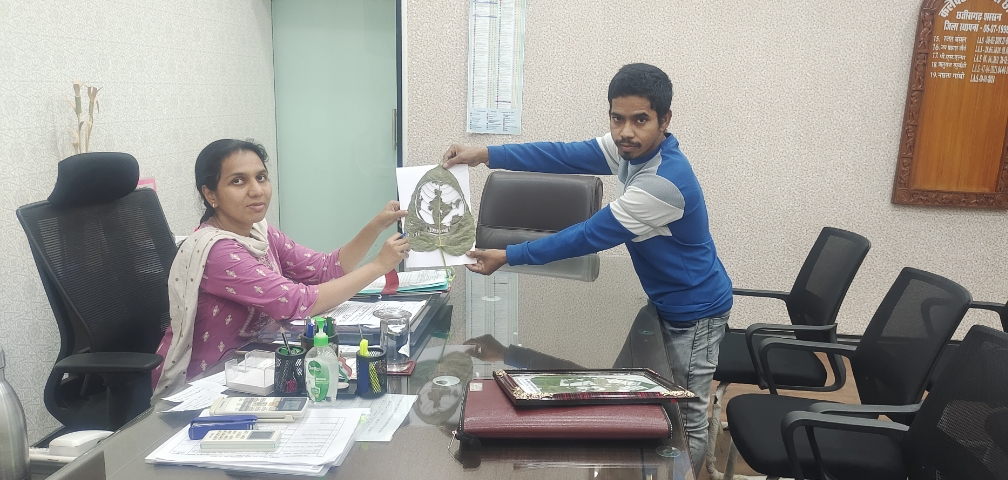 कलेक्टर सुश्री नम्रता गांधी को भेंट की पीपल के पत्ते पर भारत का नक्शा।