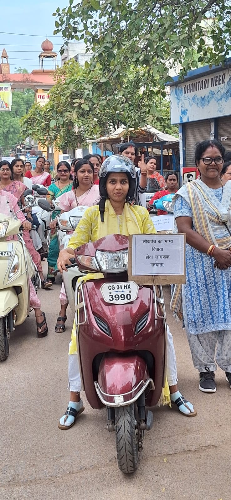 कलेक्टोरेट परिसर से निकाली गई मतदाता जागरूकता स्कूटी रैली अम्बेडकर चौक, रत्नाबांधा चौक, घड़ी चौक, सदर बाजार होते हुए विंध्यवासिनी मंदिर के पास सम्पन्न हुई। रैली के साथ ही साथ महिलाओं ने सारे काम छोड़ दो, सबसे पहले वोट दो, उम्र 18 पूरी है, वोट देना जरूरी है, जिला धमतरी वोट सर्वाेपरी, प्रजातंत्र की है पहचान, उंगली पर हो एक निशान, सशक्त लोकतंत्र में पहचान, सशक्त नारी, शत-प्रतिशत मतदान का भी नारा लगाया। इस मौके पर कलेक्टर सुश्री गांधी ने जिलेवासियों को अनिवार्य रूप से मतदान करने की अपील की। रैली में जिला कार्यक्रम अधिकारी महिला एवं बाल विकास विभाग श्रीमती जगरानी एक्का, परियोजना अधिकारी श्रीमती चित्ररेखा यादव, शैलेन्द्र गुप्ता सहित बड़ी संख्या में महिलाएं उपस्थित रहीं।