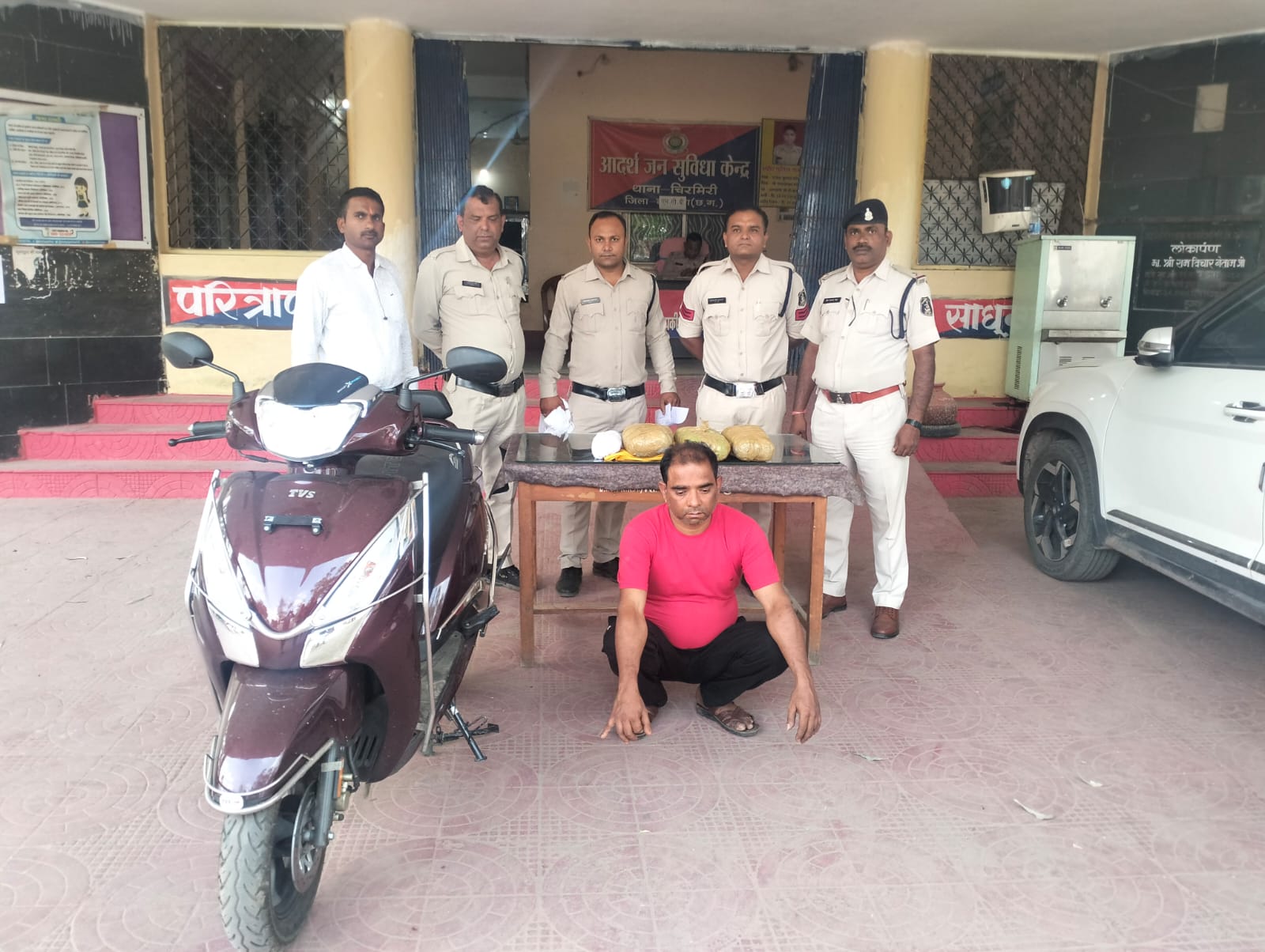उपरोक्त संबंध में प्राप्त जानकारी के अनुसार पुलिस पेट्रोलिंग के दौरान थाना चिरमिरी क्षेत्रांर्गत मुखबिर द्वारा सूचना मिली कि गेल्हापानी का संतोष पटेल उर्फ मुनवा बैकुण्ठपुर की ओर से लक्ष्मण झरिया जंगल मेन रोड होते हुये अपनी स्कूटी में गांजा लेकर गेल्हापानी आ रहा है। सूचना पर थाना प्रभारी चिरमिरी द्वारा पुलिस टीम गठित कर मुखबिर के बताये स्थान पर जाकर घेराबंदी किया गया, कुछ देर में एक व्यक्ति स्कूटी में आते दिखा, जिसे रोककर उसका नाम पता पूछने पर उसने अपना नाम संतोष पटेल उर्फ मुनवा पिता स्व. बंधन पटेल जाति कुर्मी उम्र 44 वर्ष निवासी गेल्हापानी घोड़ा दफाई गेल्हापानी चिरमिरी का रहने वाला बताया, जिसके कब्जे से 03 पैकेट प्रत्येक पैकेट 01-01 किलो का कुल 03 किलोग्राम मादक पदार्थ गांजा कीमत 30000 रुपये तथाघटना में प्रयुक्त टीव्हीएस ज्यूपिटर स्कूटी बिना नम्बर कीमत 70000 रुपये कुल कीमत 1,00,000/- (एक लाख रुपये) को गवाहों के समक्ष जप्त किया गया है।आरोपी का कृत्य धारा 20 (बी) एनडीपीएस एक्ट के तहत पाये जाने से आरोपी को दिनांक 23.04.2024 को गिरफ्तार कर न्यायिक अभिरक्षा में भेजा गया है।