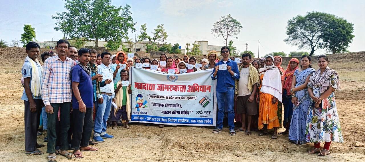 उत्तर बस्तर कांकेर :- कलेक्टर एवं जिला निर्वाचन अधिकारी अभिजीत सिंह के निर्देश पर और जिला पंचायत के सीईओ एवं स्वीप के नोडल अधिकारी सुमित अग्रवाल के मार्गदर्शन में मतदाता जागरूकता अभियान के तहत जिले के मतदाताओं को शत-प्रतिशत मतदान के लिए जागरूक किया जा रहा है। इसी क्रम में आज जिला मुख्यालय के समीप ग्राम नंदनमारा के मनरेगा कार्य स्थल में कार्यरत श्रमिकों एवं ग्रामीणों से लोकसभा निर्वाचन में 26 अप्रैल को शत-प्रतिशत मतदान करने का आग्रह किया गया। इसके साथ ही जनपद पंचायत के अतिरिक्त मुख्य कार्यपालन अधिकारी द्वारा श्रमिकों एवं ग्रामीणों को शपथ दिलाई गई तथा ‘‘शत-प्रतिशत वोट नंदनमारा’’ के नारे भी लगाए गए।