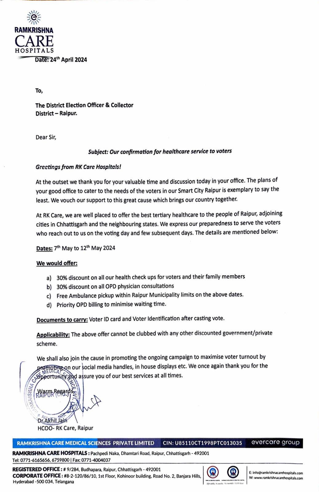 रामकृष्ण केयर हॉस्पिटल के चीफ ऑपरेटिंग ऑफिसर डॉ अखिल ने कलेक्टर डॉ. गौरव सिंह से मुलाकात कर उन्हें अपने इस ऑफर से अवगत कराया। हॉस्पिटल द्वारा मतदान तिथि 07 मई को वोट देने वाले मतदाताओं और उनके परिवारजनों को सभी प्रकार के स्वास्थ्य जांच में 30 प्रतिशत की छूट दी जाएगी। इसके साथ ही ओपीडी फिजिशियन कंसल्टेशन में भी 30 प्रतिशत की छूट हॉस्पिटल द्वारा दी जाएगी। जिससे लोग अधिक से अधिक वोट करने के लिए प्रेरित हांेगे। हॉस्पिटल प्रबंधन ने बताया कि लोकतंत्र को मजबूत बनाने के लिए और नागरिकों को मतदान के लिए प्रेरित करने हेतु यह पहल की गई है। हॉस्पिटल द्वारा मतदान के दिन से 12 मई तक रायपुर नगर निगम क्षेत्र में मतदाताओं के लिए निःशुल्क एंबुलेंस पिकअप की सुविधा भी रहेगी। इसके साथ ही उन्हें ओपीडी बिलिंग में भी प्राथमिकता मिलेगी जिससे मतदान करने वाले नागरिकों को प्रतीक्षा नही करना पड़ेगा। मतदाताओं को प्रेरित करने के उद्देश्य से यह स्कीम लागू की जा रही है जो 07 मई से 12 मई 2024 तक उपलब्ध रहेगी। प्रबंधन द्वारा कलेक्टर एवं जिला निर्वाचन अधिकारी को इस आशय का पत्र भी सौंपा गया है। इस दौरान नगर निगम कमिश्नर अबिनाश मिश्रा, जिला पंचायत सीईओ विश्वदीप उपस्थित थे।