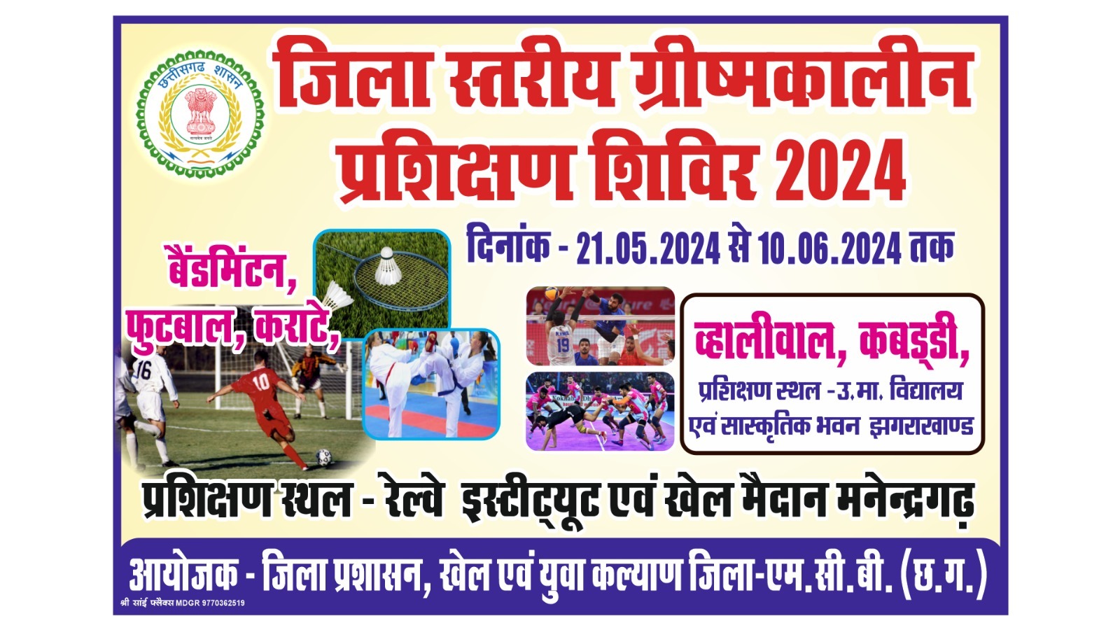 मनेंद्रगढ़/एमसीबी :- जिले में खेल गतिविधियों को बढ़ावा देन के लिए और नवोदित खिलाड़ियों में खेल के प्रति जागरूकता लाने के लिए 21 मई 2024 से 10 जून 2024 तक 21 दिवसीय ग्रीष्मकालीन खेल प्रशिक्षण शिविर का आयोजन कलेक्टर डी. राहुल वेंकट के निर्देशन एवं मार्गदर्शन में किया जा रहा है। यह शिविर जिले के तीनों विकासखण्ड़ों में विभिन्न खेलों के माध्यम से सम्पन्न किया जायेगा। मनेंद्रगढ़ में रेल्वे खेल मैदान तथा इंस्टीट्यूट मे फुटबाल, कराते झगराखाण्ड़ सिंधी सोसायटी स्कूल में व्हालीबॉल एवं सांस्कृतिक भवन वार्ड नम्बर 7 में कबड्डी शिविर का आयोजन होगा। चिरमिरी के लाल बहादूर शास्त्री मैदान गोदरीपारा में फुटबाल, हैण्डबाल, कबड्डी एवं कराते का प्रशिक्षण दिया जायेगा। इसके साथ ही भरतपुर के इन्द्रप्रस्त स्टेडियम में फुटबाल, व्हालीबाल, कबड्डी एवं कराते का शिविर संचालित होगा। खेल अधिकारी गोपाल सिंह ने जिले के समस्त युवाओं को अधिक से अधिक संख्या में भाग लेकर अपनी क्षमता एवं योग्यता को बढ़ाने का आग्रह किया है। जिले के व्यायाम शिक्षक एवं वरिष्ठ खिलाड़ियों के द्वारा यह प्रशिक्षण दिया जायेगा। इसमें सब जूनियर और जूनियर खिलाड़ियों को यह प्रशिक्षण प्रदान किया जायेगा। यह शिविर प्रातः 06ः00 बजे से 08ः00 बजे तक तथा सायं 4ः30 बजे से 6ः30 बजे तक संचालित होगा। इस शिविर का उद्देश्य जिले में खेल के विकास एवं खिलाड़ियों के शारीरिक एवं मानसिक विकास को बढ़ावा देना है। यह शिविर खेल एवं युवा कल्याण विभाग जिला एम.सी.बी. द्वारा संचालित किया जायेगा।