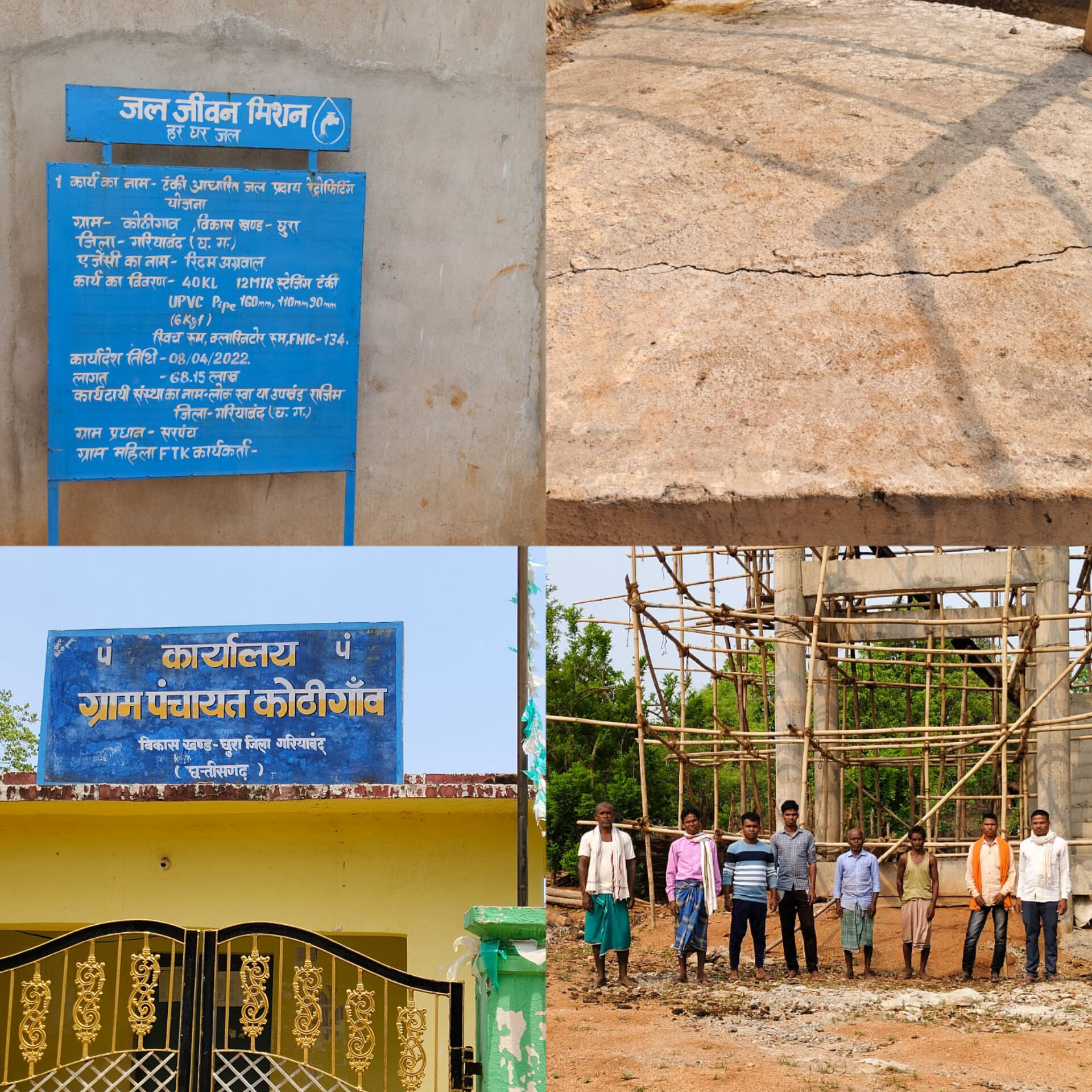 किंतु हम गरियाबंद जिले अंतर्गत ग्राम पंचायत कोठीगांव के नवनिर्मित पानी टंकी की बात करें तो टंकी जैसे तैसे बनकर तैयार हुए लगभग दो वर्ष तो हो गया है लेकिन अभी शुरू होने से पहले ही नीचे के बने चेंबर टुटने लगा है वहीं पानी टंकी की सीढ़ी में दरारें पड़ने लगी है और टंकी की स्थिति देखें तो शुरू होने से पहले ही हाल बेहाल नजर आने लगा है वहीं ग्रामवासियों का कहना है कि ठेकेदार के द्वारा ये काम आनन फानन तरीके से किया गया निर्माण के समय इसमें पानी की तराई भी नहीं किया गया और ये शुरू होने से पहले ही स्थिति जर्जर होने लगी है और विभागीय अधिकारियों की उदासीनता के चलते ठेकेदारों के द्वारा इस प्रकार काम किया गया है और हम इस प्रकार के स्तरहीन निर्माण कार्यों को देखते हुए विभागीय अधिकारियों से निवेदन करेंगे कि इसे तोड़ कर दुसरा टंकी पुनः ठेकेदार निर्माण कराये और ऐसा नहीं करते हैं तो हम जिला कलेक्टर से गुहार लगाएंगे और अंततः इस प्रकार पानी टंकी को शुरू करने नहीं देंगे जो आगे चलकर किसी प्रकार के हादसे को आमंत्रित करे।